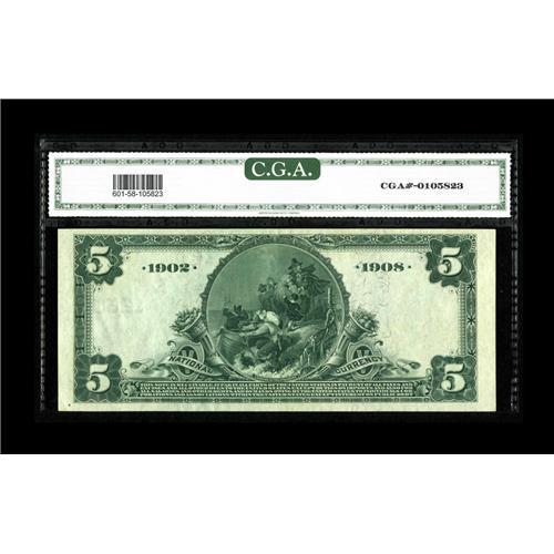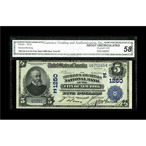 <B>New York, NY</B></I> - $5 1902 Date Back Fr. 593 <B>The Mechanics & Metals NB</B></I> Ch. # (E)1250<BR>The <B>CGA About Uncirculated 58</B></I> holder designates this Date Back as a Fr. 601 Plain Back. Only a very difficult to detect center fold keeps this bright note from full uncirculated status.<BR><BR><b>Shipping:</b> Coin/Currency (<a target="_blank" href="http://www.heritageauctions.com/common/shipping.php">view shipping information</a>)