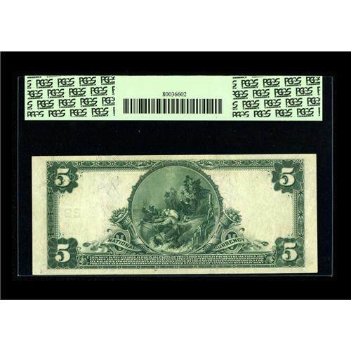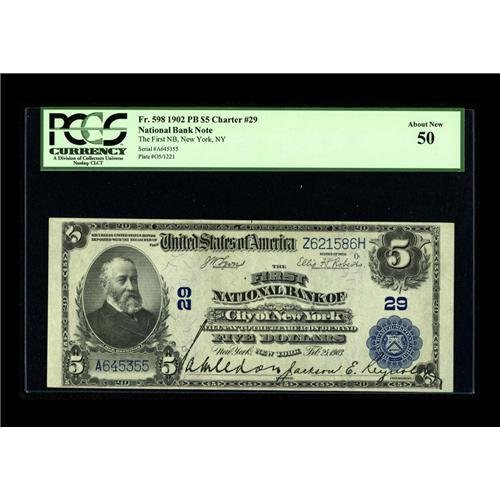 <B>New York, NY</B></I> - $5 1902 Plain Back Fr. 598 <B>The First NB</B></I> Ch. # 29<BR>A well centered example that would slip quite easily into any collection of fully uncirculated Nationals. While there must be a reason to justify a grade of less than 63 or better, we are unable to detect it through the encapsulation surfaces. Expect a winning bid that will be in excess of the typical price paid for an AU note of this type and denomination. <B>PCGS About New 50.</B></I><BR><BR><b>Shipping:</b> Coin/Currency (<a target="_blank" href="http://www.heritageauctions.com/common/shipping.php">view shipping information</a>)