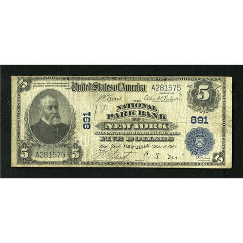 <B>New York, NY</B></I> - $5 1902 Plain Back Fr. 598 <B>The National Park Bank</B></I> Ch. # 891<BR>Neat BEP engraved signatures are seen on this solidly margined note. <B>Very Good+</B></I><BR><BR><b>Shipping:</b> Coins & Currency (<a target="_blank" href="http://www.heritageauctions.com/common/shipping.php">view shipping information</a>)