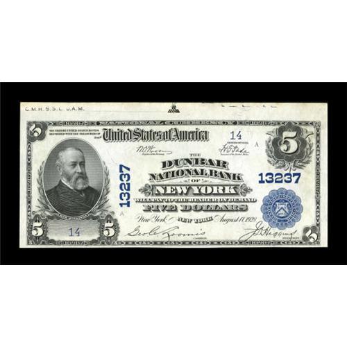 <B>New York, NY</B></I> - $5 1902 Plain Back Fr. 611 <B>The Dunbar NB</B></I> Ch. # 13237<BR> A nice example from this late charter institution, which was founded by the Rockefeller family to facilitate commerce in New York's black community. The bank was located in Harlem, which in the 1920's was a thriving area in the midst of the so-called "Harlem Renaissance," a flowering of black literature, art and business development. <B>Choice Crisp Uncirculated, </B></I> with the full top selvage attached, and bearing low serial number 14 as a bonus. <BR><BR><b>Shipping:</b> Coins & Currency (<a target="_blank" href="http://www.heritageauctions.com/common/shipping.php">view shipping information</a>)
