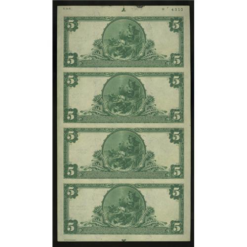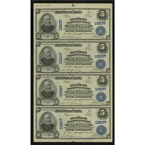 <B>New York, NY</B></I> - $5-$5-$5-$5 1902 Plain Back Fr. 611 <B>The Dunbar NB</B></I> Ch. # 13237 Uncut Sheet<BR>This is a lovely uncut sheet bearing low serial number 30. Luckily someone put away low serial number sheets on this Black owned national bank, one of only two in the nation during the National era. This is also a tougher Friedberg number with the Woods-Tate Treasury signature combination demanding a premium. This sheet has toned a shade. <B>Choice Crisp Uncirculated.</B></I><BR><BR><b>Shipping:</b> Coin/Currency (<a target="_blank" href="http://www.heritageauctions.com/common/shipping.php">view shipping information</a>)