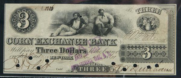 New York, NY. Corn Exchange Bank. $3.00 March 4, 1861. PCGS Very Fine 35. Haxby NY-1555-G6c. This hole punch cancelled example is listed as "SENC" in Haxby, and is the first example that we've ever seen. It is free of any damage or problems, and more importantly is a fully genuine example--counterfeits are much more common--proved by a "PAID" stamp cancellation from 1884. Another very rare New York obsolete, and worthy of consideration by any advanced collector.