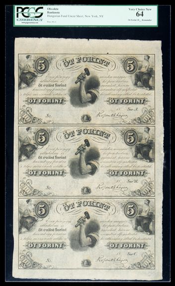 New York, NY - Hungarian Fund Uncut Remainder Sheet of Three. $5-5-5. PCGS Very Choice New 64. Appealing symbolism is expressed through the vignettes on these $5 notes.