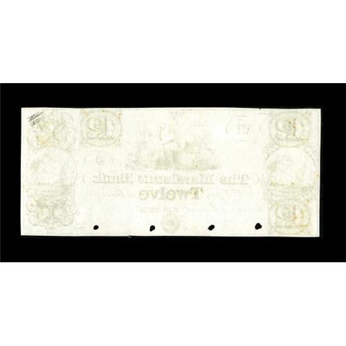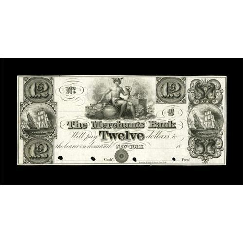 <B>New York, NY- Merchants Bank</B></I> $12 G63 Proof<BR> Another excessively rare note which traces its pedigree back to the Western Reserve sale of 1996 and thence to the Schingoethe holdings, where it sold for $2875 when auctioned in March of 2006. We do not know why notes of this denomination were contemplated by this bank, but this institution was a well regarded bank which later went on to accept a National charter. <B>Uncirculated,</B></I> 4 POC, a stupendous example. <BR><I>From The Collection of a Louisiana Gentleman.</B></I><BR><BR><b>Shipping:</b> Coins & Currency (<a target="_blank" href="http://www.heritageauctions.com/common/shipping.php">view shipping information</a>)