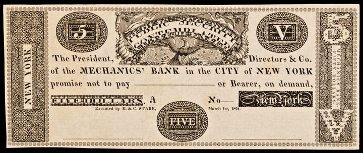 New York, NY. The Mechanics’ Bank in the City of New York. Five Dollars. February 10, 1824. by “E. & C. Starr.” Rare “Test Progress Note.” Very Choice India Paper Proof.