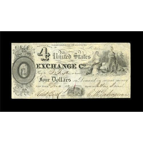 <B>New York, NY- United States Exchange Co. </B></I>$4 Harris 1060<BR> We have had examples of this issuer only once before. This issuer is also listed in the Wait Maine reference because these notes were issued in New York City, but payable in Portland, Maine. <B>Extremely Fine+.</B></I><BR><BR><b>Shipping:</b> Coins & Currency (<a target="_blank" href="http://www.heritageauctions.com/common/shipping.php">view shipping information</a>)