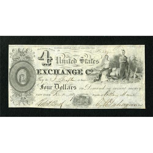 <B>New York, NY- United States Exchange Co.</B></I> $4 Dec. 11, 1837 Harris 1060<BR> This issuer is also listed in the Wait Maine reference, as this note, while issued from New York City, was payable at Portland, Maine. <B>Choice</B></I> <B>About Uncirculated </B></I>with strong embossing.<BR><I>From The Collection of a Louisiana Gentleman</B></I><BR><BR><b>Shipping:</b> Coins & Currency (<a target="_blank" href="http://www.heritageauctions.com/common/shipping.php">view shipping information</a>)