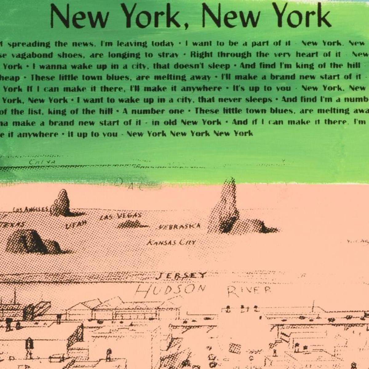New York, New York by "Ringo" Daniel Funes. "New York, New York" is a one-of-a-kind hand-pulled silkscreen and mixed media painting on canvas by Ringo (Daniel Funes) - protege of Andy Warhol's apprentice, Steve Kaufman. This piece is hand signed by the artist and Includes Certificate of Authenticity. This piece comes from the Andy Warhol Legacy Series. Measures approx. 14" x 16" (image). ** Please note: the signature for this piece is located within the right border and will be outside the display image when framed; see photo for reference. **