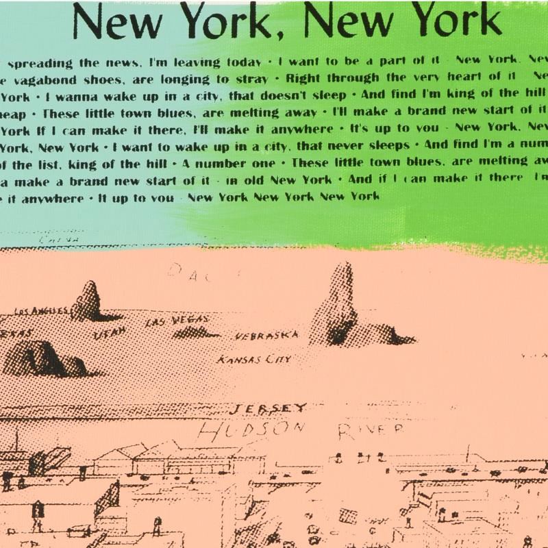 "New York, New York" is a one-of-a-kind hand-pulled silkscreen and mixed media painting on canvas by Ringo (Daniel Funes) - protege of Andy Warhol's apprentice, Steve Kaufman. This piece is hand signed by the artist and Includes Certificate of Authenticity. This piece comes from the Andy Warhol Legacy Series. Measures approx. 14" x 16" (image). ** Please note: the signature for this piece is located within the right border and will be outside the display image when framed; see photo for reference. **