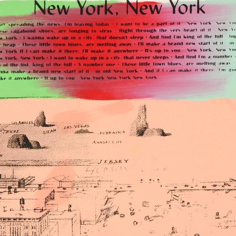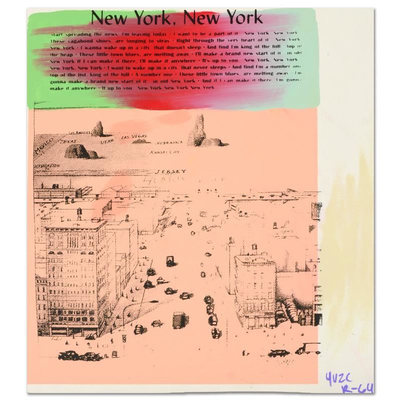 "New York, New York" is a one-of-a-kind hand-pulled silkscreen and mixed media painting on canvas by Ringo (Daniel Funes) - protege of Andy Warhol's apprentice, Steve Kaufman. This piece is hand signed by the artist and Includes Certificate of Authenticity. This piece comes from the Andy Warhol Legacy Series. Measures approx. 14" x 16" (image). ** Please note: the signature for this piece is located within the right border and will be outside the display image when framed; see photo for reference. **