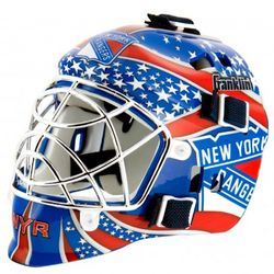 This collectible miniature goalie mask features an authentic pro-style mask/cage design with molded plastic vented shell with foam liner, a chrome finish "cat-eye" welded steel cage, full function adjustable back plate, and an approximate mask size of 5"x4". The mini’s have the same graphics as the full size series shown, with the exception of the Franklin/ NHL® logo on forehead area (on the mini it’s located on the mask back plate).. Made By Franklin Sports
