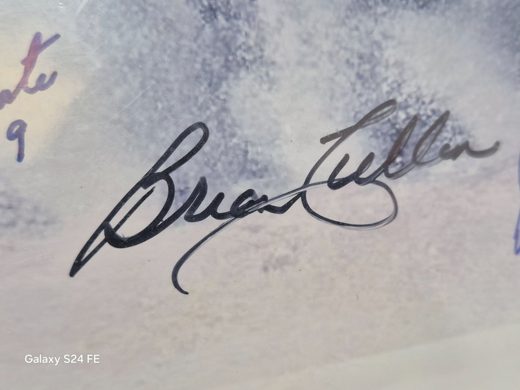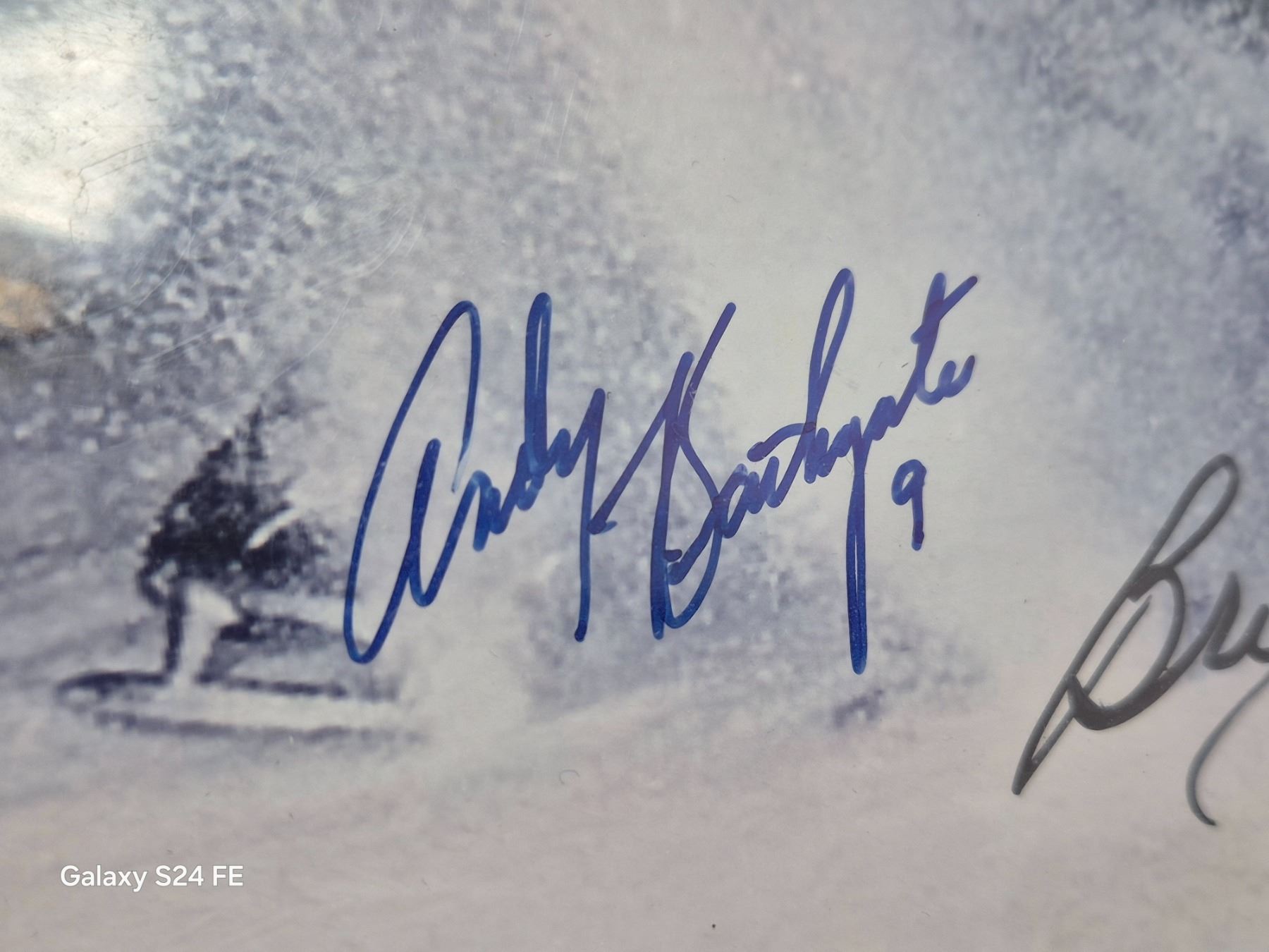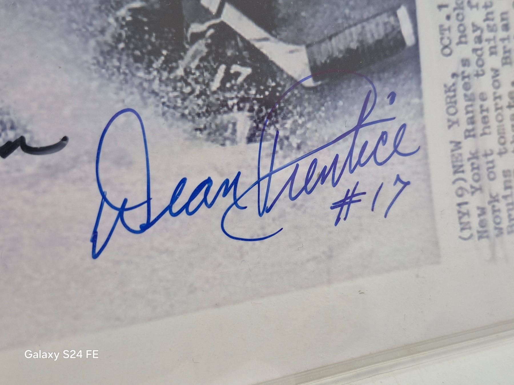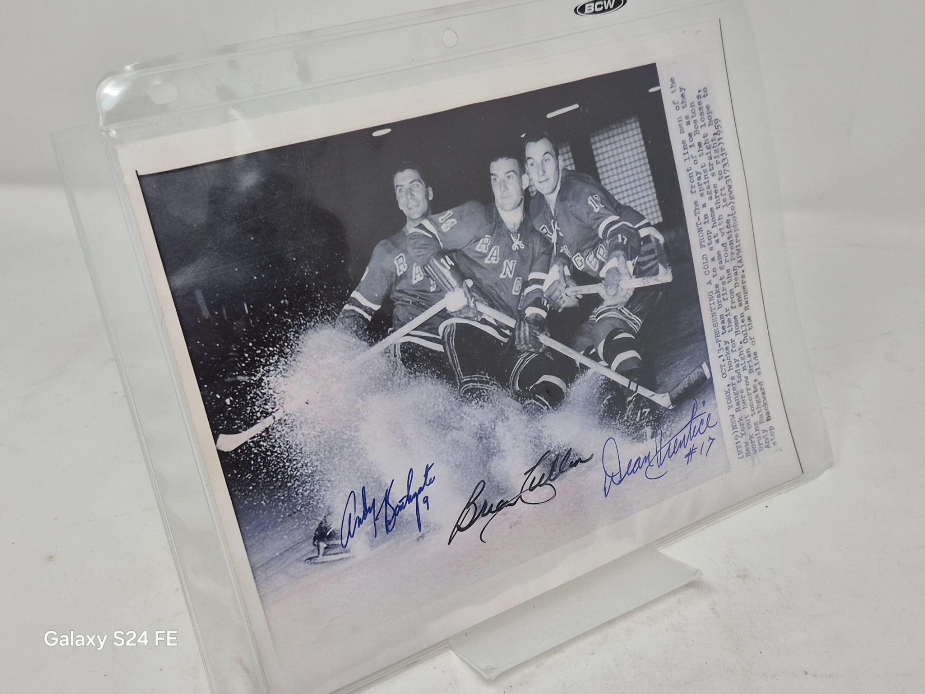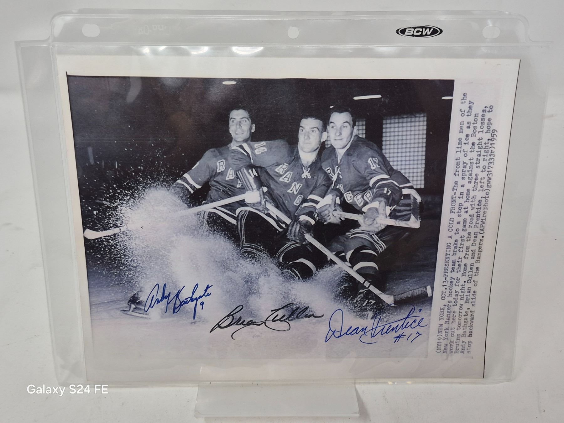 Black and white vintage photo featuring the iconic Rangers trio—Andy Bathgate, Dean Prentice (#17), and Bruce Cullen—caught mid-action and signed by all three. Includes press caption and signatures.