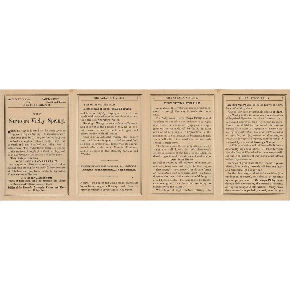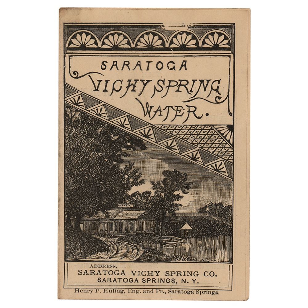 Eight-page brochure of the Saratoga Vichy Springs Co., Saratoga Springs, NY. Henry P. Hulling, Engraver and Printer, Saratoga Springs. Circa 1912. Detailed description of the Saratoga Vichy Spring, with engraving of the Spring on page one. “This Spring is located on Ballston Avenue opposite Geyser Spring. It was discovered in the year 1872 by drilling to the depth of one hundred and fifty feet of solid rock.” “Saratoga Vichy will quiet the nerves and produce refreshing sleep.” “An Excellent Table Water.” List of prices. Company’s office located at 122 Pearl St. New York. In fine condition.