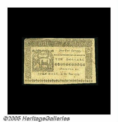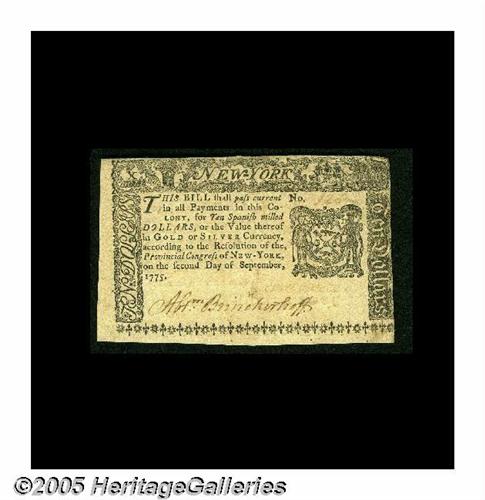 <B>New York September 2, 1775 $10 Choice About New.</B></I> Irregularly margined with two large and two small margins, but with beautiful, sharp printing and tremendous eye appeal on both sides. This scarce note has a vignette of an elephant on the back. Seldom seen anywhere near this nice.