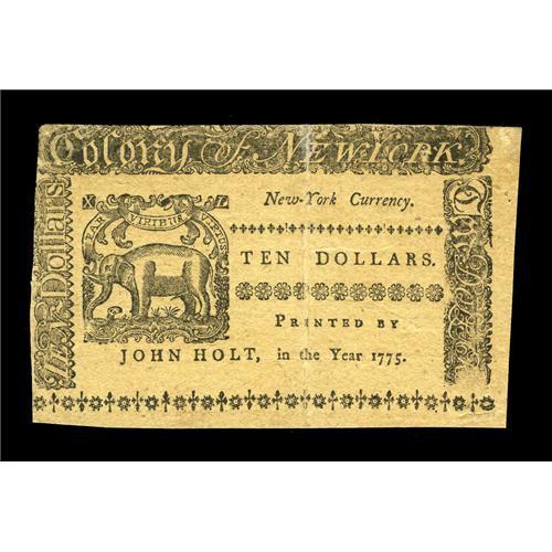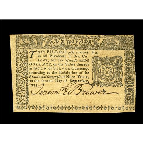 <B>New York September 2, 1775 $10 Extremely Fine-About New.</B></I> The centering is a little off, but the note is a very handsome example of a scarce issue and denomination. The elephant vignette on the back is bold and clear.