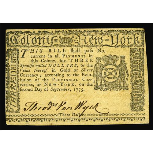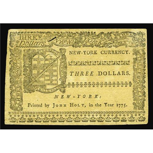 <B>New York September 2, 1775 $3 Choice About New.</B></I> Both the New York State Coat of Arms on the Face and the Ten Commandment vignette on the back are sharp and clean. Good-looking New York notes are notoriously difficult to find when one is attempting to assemble a thirteen-colony set. This piece would certainly do the job.