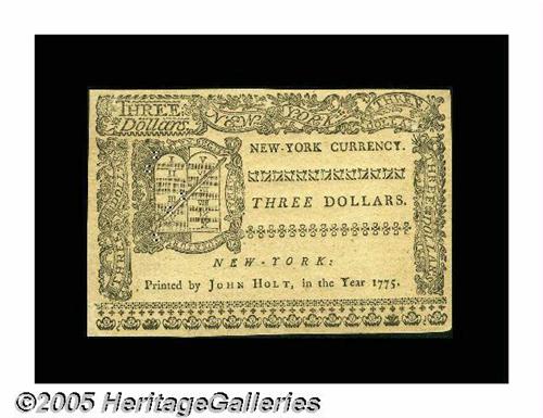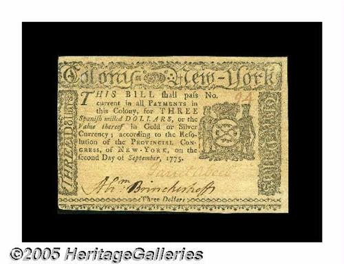 <B>New York September 2, 1775 $3 Very Choice New.</B></I> In all our sales, we've had around 20 notes from this issue, most of which have been well circulated, and the very best of which has been Extremely Fine. This note would be a perfect Gem if it weren't for the left face margin's just touching the design. The back, with its beautiful Ten Commandments vignette, is well centered and perfect. A seriously rare note in this high a grade.