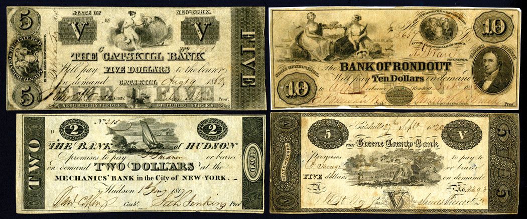 lot of 4 notes, All New York State Issues and all issued, Includes 1853, Roundout, Bank of Roundout, $10, RWHE, Appears to be Counterfeit, mounted on white paper, VG; Catskill, Greene County Bank, 1820, $5, Thins in 3 small areas of the back where evidently was removed from mounting, Fine, also Counterfeit; Hudson, Bank of Hudson, 1817, $2, VF; and, Catskill. Catskill Bank, 1862, $5 but evidently taken from redone old plate (ca. 1830's) since there is an ABC monogram to the left of the vignette. Attractive New York obsoletes.