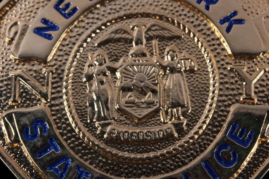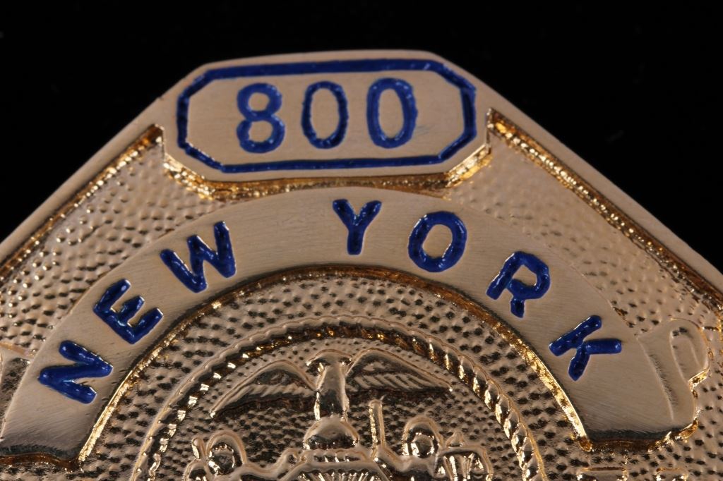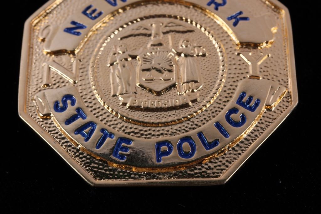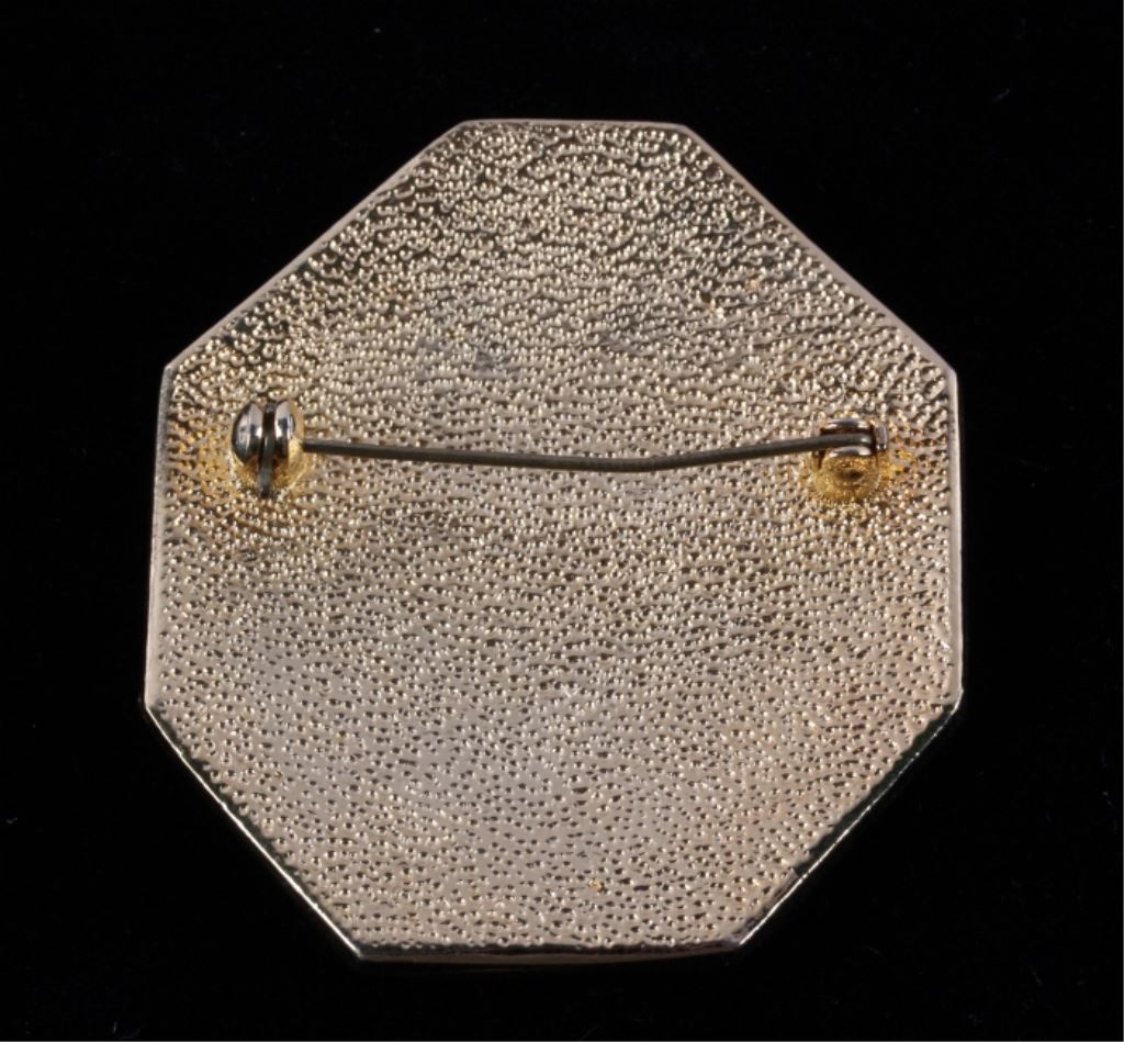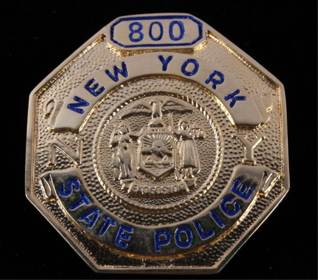 This is a brass construction with navy enamel lettering octagon shaped badge from the New York State Police. The badge has the number 800 across the top and the state seal across the middle. This is in good condition and is a scarcely seen rare badge. Measures 2"x2.25"