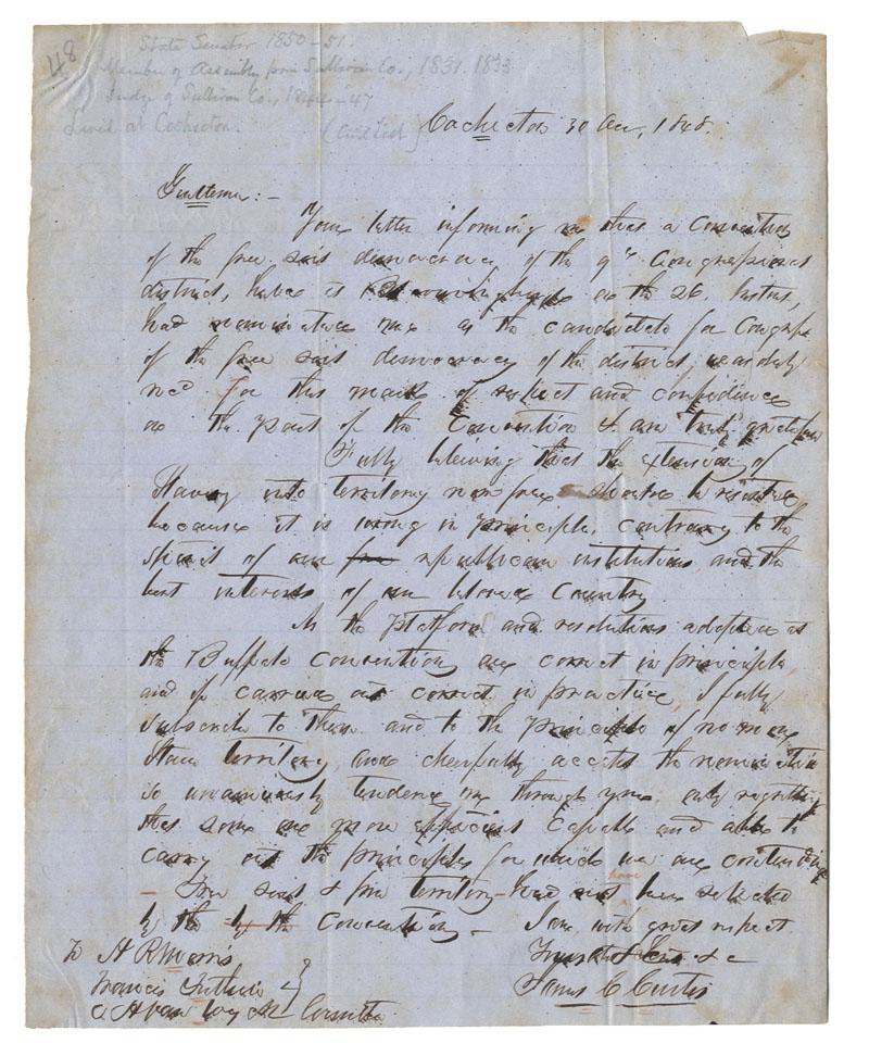 "the extension of Slavery into Territory now free should be resisted because it is wrong in principle, contrary to the spirit of our republican institution and the best interests of our blessed Country” James C. Curtis. New York state senator and free soil party member. Curtis writes just after his nomination for state senator by the newly formed Free Soil Party convention. ALS. 1 page. Cochecton, 30 Aug., 1848. “Your letter informing me that a convention of the free soil democracy of the 9th Congressional district had nominated me as the candidate for Congress of the free soil democracy of the district was duly received. For this mark of respect and confidence on the part of the convention I am truly grateful. Fully believing that the extension of Slavery into Territory now free should be resisted because it is wrong in principle, contrary to the spirit of our republican institution and the best interests of our blessed Country. As the platform and resolutions adopted at the Buffalo convention are correct in principal and of course are correct in practice. I fully subscribe to them and to the principle of no more Slave Territory and cheerfully accept the nomination so unanimously tendered me through you only regretting that some are more efficious capable and able to carry out the principal for which we are contending. Free soil & free territory have been selected by the convention. I am with great respect, Yours…James C. Curtis. The Free Soil party had just held its first convention on August 9 and 10th. Organized on a platform which opposed the admission of any new slave states into the Union. In 1854, the party was absorbed into the new Republican party.