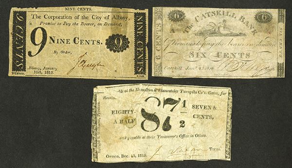 New York, Lot of 3 notes, includes 1). 1815, Corporation of the City of Albany, 9 cents, I/U, Fine to VF with tape repair on UR; 2). 1816, Catskill Bank, 6 cents, VG condition; 3). Otisco, NY. 1815, Hamilton & Skaneateles Turnpike Co., 87 1/2 cents scrip note, VG condition with large internal pre-printing paper fold. Scarce scrip note trio with rarely seen odd denominations.