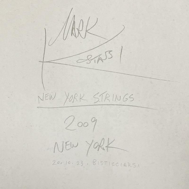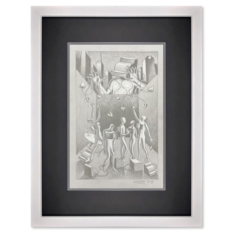 "New York Strings" is an original drawing on paper by Mark Kostabi, hand signed by the artist. This piece comes custom framed and includes a certificate of authenticity. Measures approximately 17.5" x 13" (frame), 11.5" x 7" (image). This item requires special handling and may have a longer than usual turnaround.