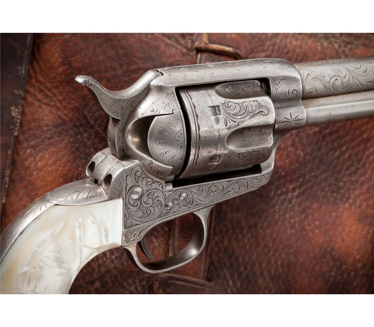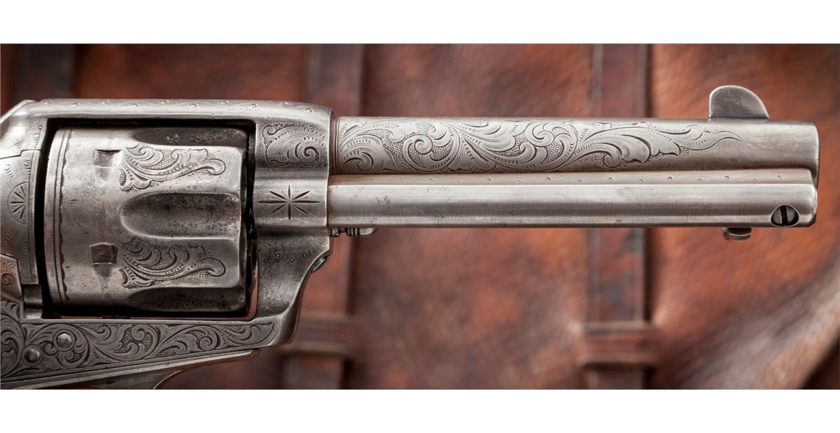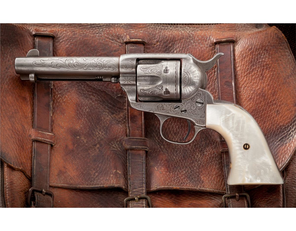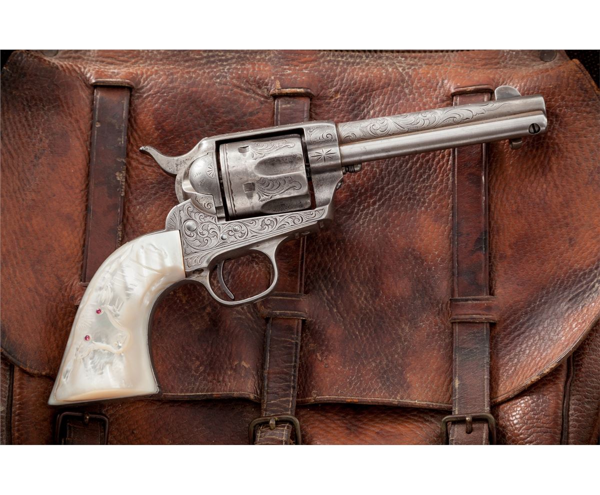 New York Style Engraved Antique Colt Single Action Army Revolver, #105790, .45 Colt cal., 4-3/4'' barrel, silver-plated finish, steerhead carved pearl grips with ruby eyes. Factory records confirm that a firearm bearing this serial number was shipped in the soft to Hartley & Graham, New York, Jan. 15, 1884, for their in-house engraving. This revolver appears to have had some minor restoration at one point, and the serial number has been re-stamped with the numbers being of a slightly smaller height. Engraving to frame, cylinder, barrel and backstrap appears identical to the style used by Hartley & Graham, with the correct amount of even wear and patination that would be expected over 130-year period. Pearl grips are probably later replacements, carved from standard slab pearl grips, as the overall relief of the subject matter is somewhat shallow. Condition is very good to near fine with fair amounts of silver in protected areas; cylinder with moderate even wear. Grips show nice character and are complete with minor inclusions to the butt and front strap area. Action remains crisp, bore is very good. Est.: $5,000-$7,500. (Antique)