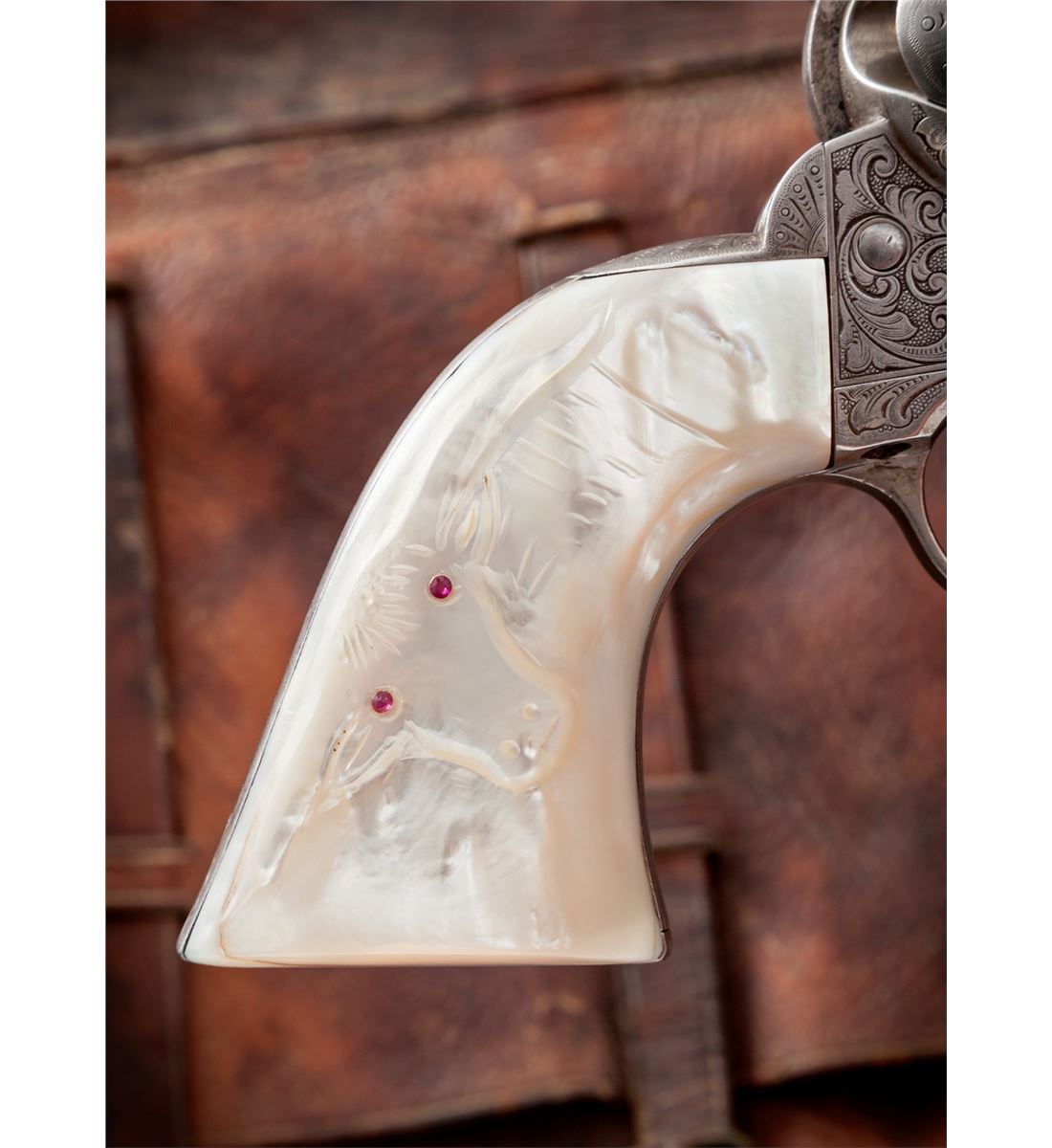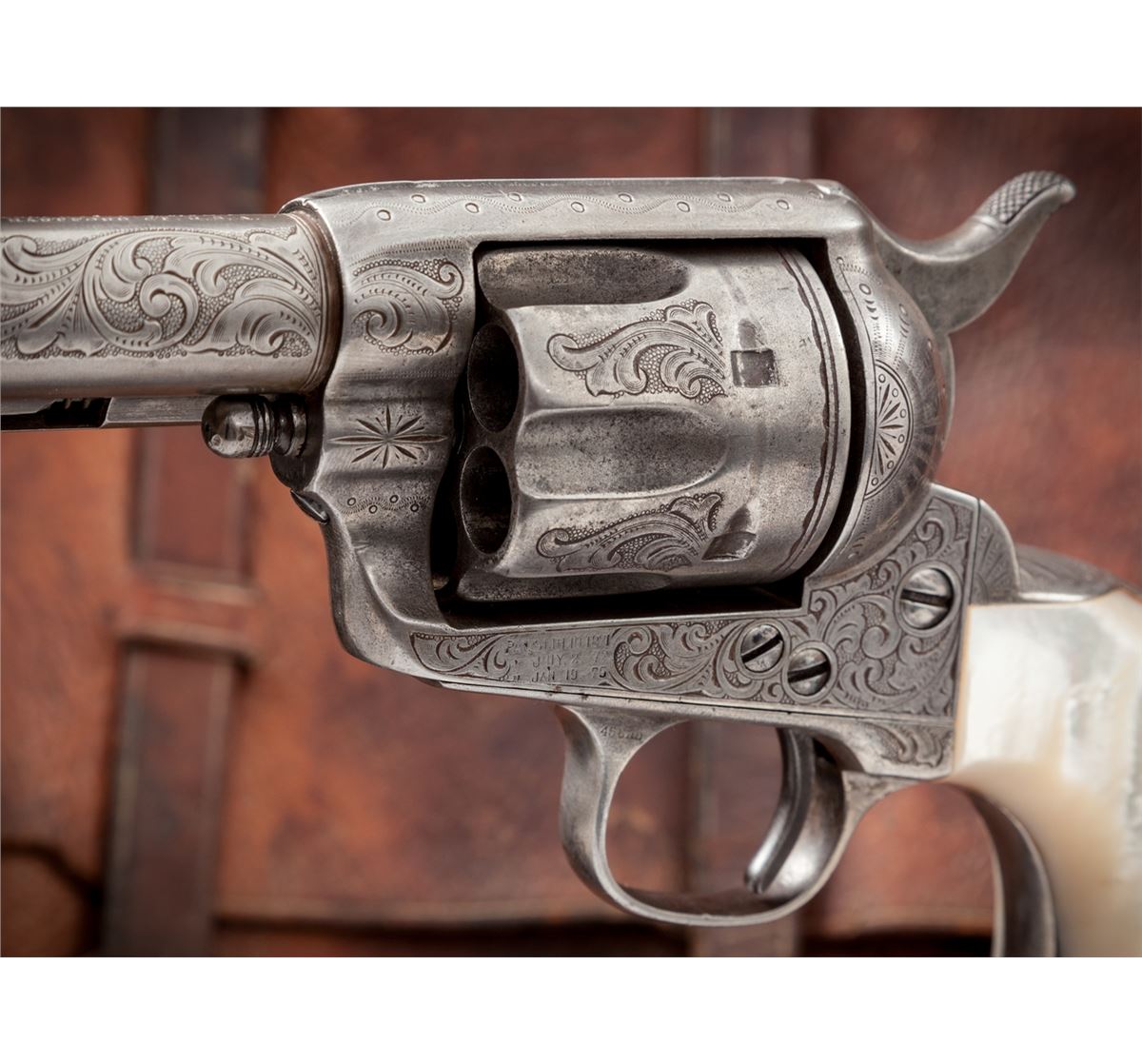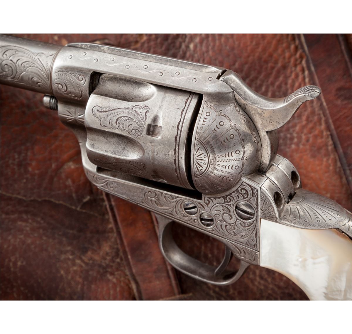 New York Style Engraved Antique Colt Single Action Army Revolver, #105790, .45 Colt cal., 4-3/4'' barrel, silver-plated finish, steerhead carved pearl grips with ruby eyes. Factory records confirm that a firearm bearing this serial number was shipped in the soft to Hartley & Graham, New York, Jan. 15, 1884, for their in-house engraving. This revolver appears to have had some minor restoration at one point, and the serial number has been re-stamped with the numbers being of a slightly smaller height. Engraving to frame, cylinder, barrel and backstrap appears identical to the style used by Hartley & Graham, with the correct amount of even wear and patination that would be expected over 130-year period. Pearl grips are probably later replacements, carved from standard slab pearl grips, as the overall relief of the subject matter is somewhat shallow. Condition is very good to near fine with fair amounts of silver in protected areas; cylinder with moderate even wear. Grips show nice character and are complete with minor inclusions to the butt and front strap area. Action remains crisp, bore is very good. Est.: $5,000-$7,500. (Antique)