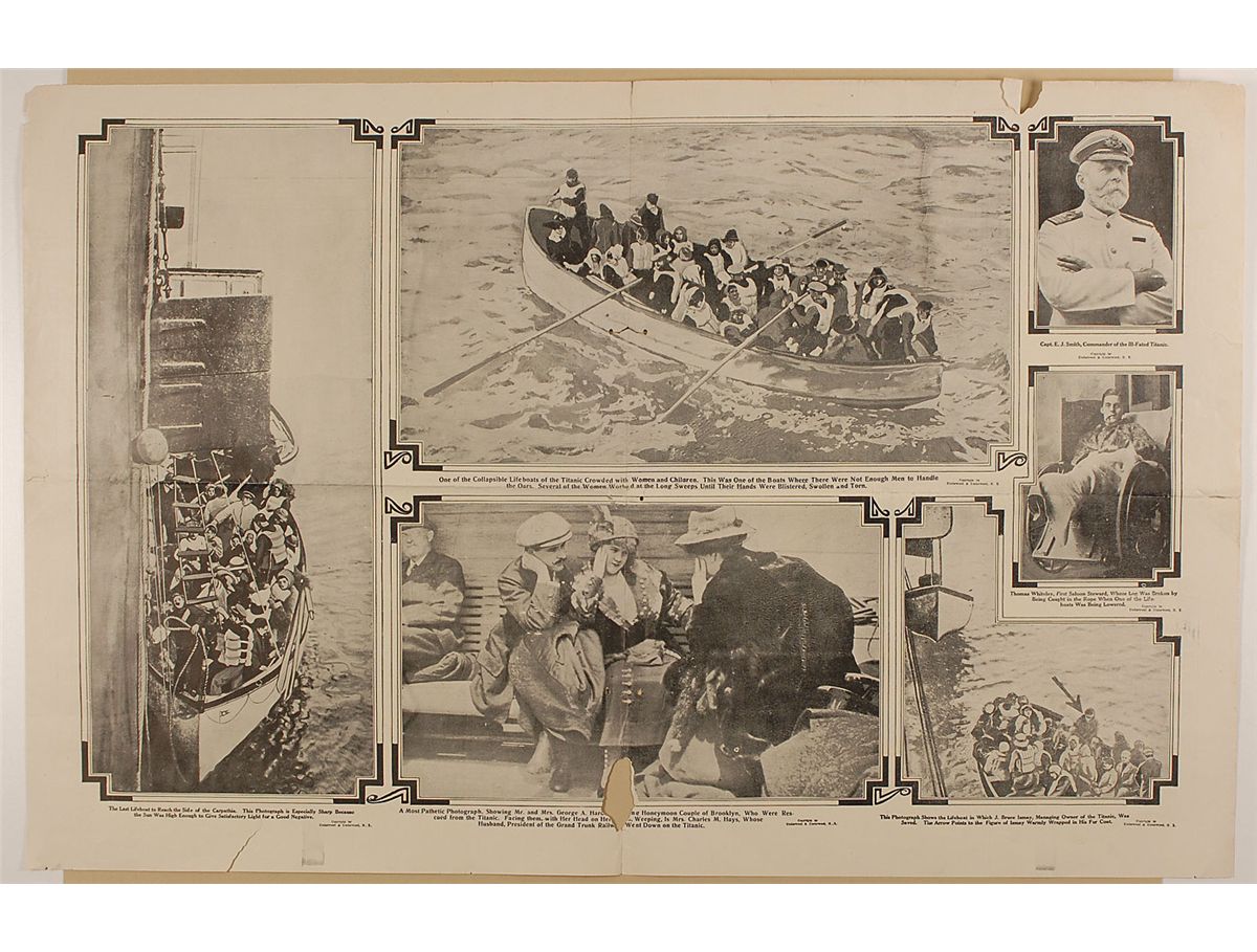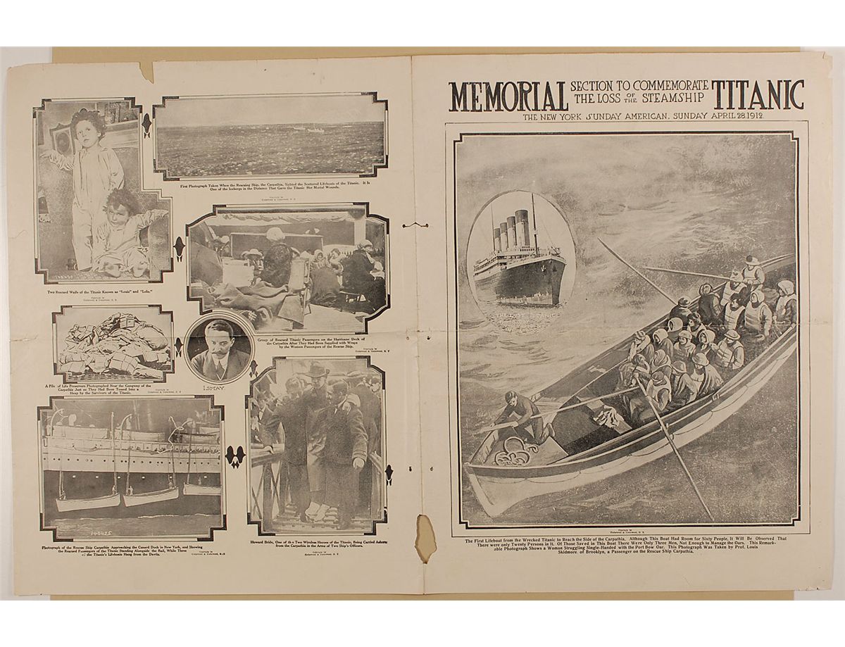Memorial Titanic newspaper “Section to Commemorate the Loss of the Steamship” from the New York Sunday American, two pages, dated April 28, 1912, featuring an artist’s rendition of survivors rowing in “the first lifeboat to reach the side of the Carpathia,” with an oval image of “The Lost Titanic” in the top left corner. Remainder of newspaper features photos of survivors and victims, and several photos of the Carpathia. In good to very good condition, with partial separations along central horizontal fold, a couple areas of paper loss to edges, several binding holes along hinge, and a few edge tears.
