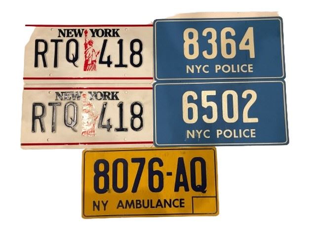 A collection of five custom made, studio used New York, New York city police, and New York ambulance license plates. The New York car license plates are made of plastic, the police and ambulance plates are made of thick cardboard.