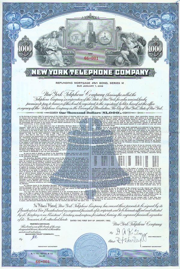 1962, New York. $1000 bond bearing 4 5/8% interest. Blue/Black. Engraved vignette of seated male and female allegorical figures flanking seal at top center. Lightly punch cancelled at bottom. Very Fine.