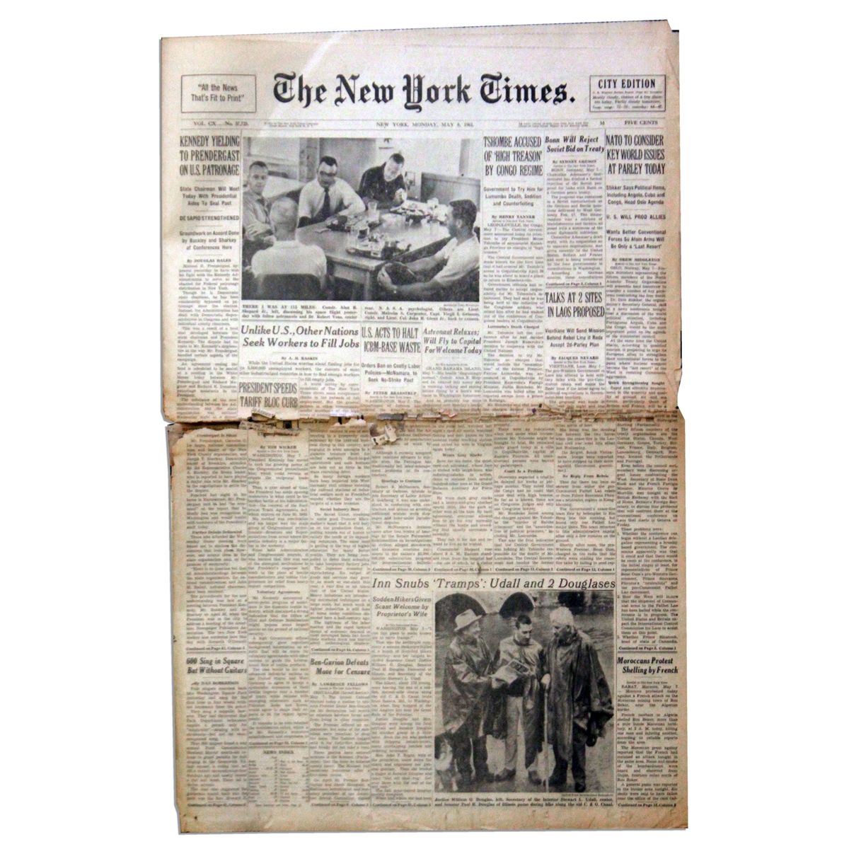 ''New York Times'' newspaper dated Tuesday, 9 May 1961, reporting on Alan Shepard as the first U.S. man in space. Headline reads: ''Washington Cheers Shepard as Hero.'' Includes picture of President Kennedy honoring the astronaut with the Distinguished Service Medal. Toning, creasing and chipping along central fold, else very good.