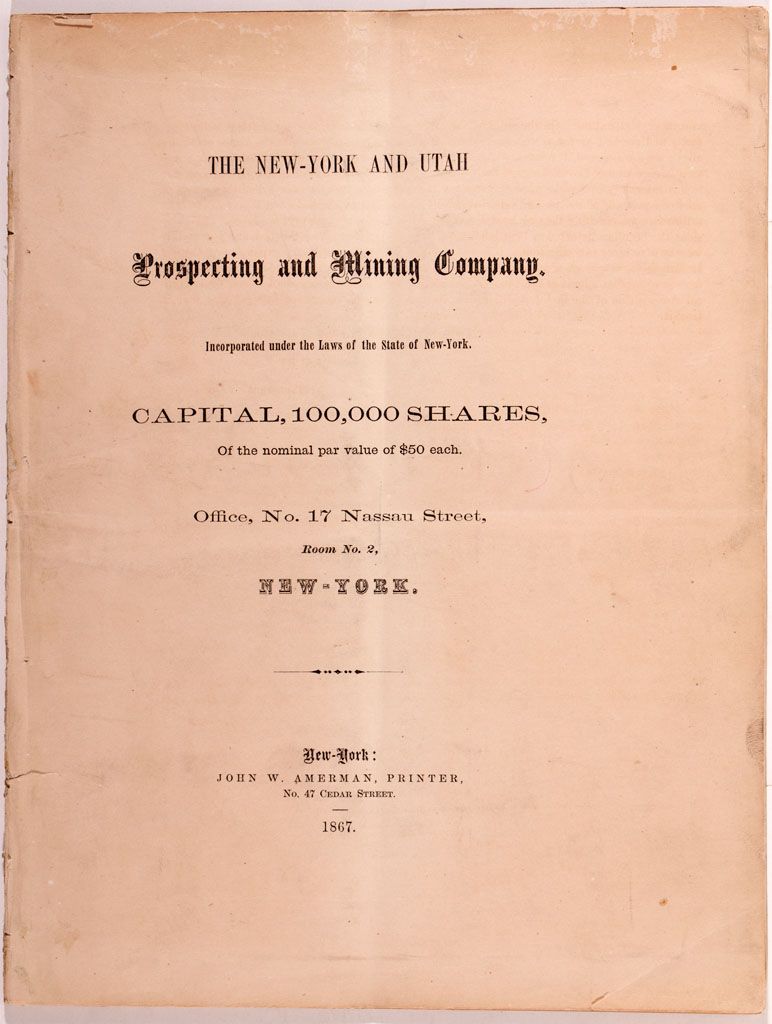 Includes information on the company owned properties in Nevada and Western Utah, as well as their plans for the areas and future value. The properties are located in, the Pah Ranagat Lake Mining District of Lincoln County Nevada, Mountain Lake District, the West Mountain District, Meadow Valley District and the Iron Mountain District. Each of the properties have a full report. The prospectus has 37 pages and the printer is identified as John W. Amerman located in New York, published in 1867. There is some wear including creases and tears and the cover has been removed. -61599