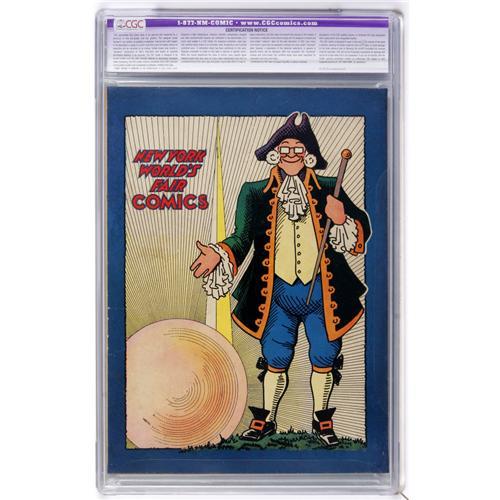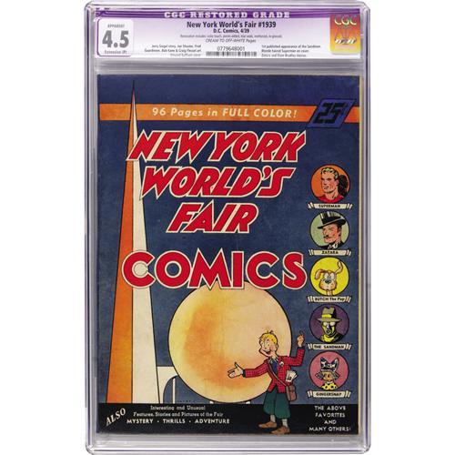 <B>New York World's Fair Comics 1939 (DC, 1939) CGC Apparent VG+ 4.5 Extensive (P) Cream to off-white pages.</B></I> This issue is listed at number 32 in Overstreet's ranking of the most valuable Golden Age books. It features the first published appearance of the Sandman. An unusually blonde-haired Superman graces the cover. The Vincent Sullivan cover has the art deco feel of the times. CGC notes, "Restoration includes: color touch, pieces added, tear seals, reinforced, re-glossed." Overstreet 2006 GD 2.0 value = $2,100; VG 4.0 value = $4,200.<BR><BR><b>Shipping:</b> Comics - Slabbed (certified) (<a target="_blank" href="http://www.heritageauctions.com/common/shipping.php">view shipping information</a>)