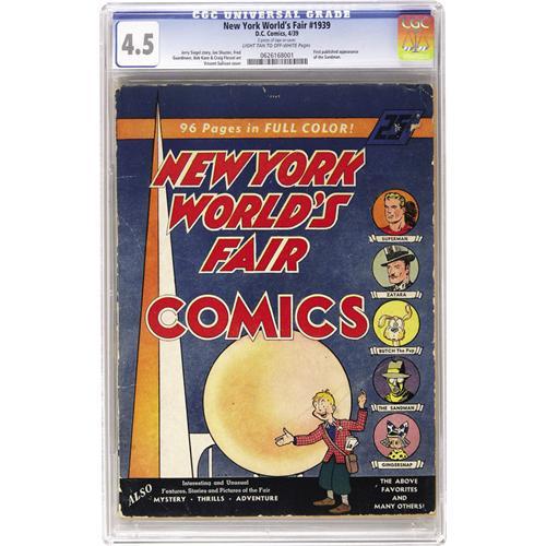 <B>New York World's Fair Comics 1939 (DC, 1939) CGC VG+ 4.5 Light tan to off-white pages.</B></I> This issue is listed at number 37 in Overstreet's ranking of the most valuable Golden Age books, and the first published appearance of the Sandman is the chief reason for the book's high desirability. If you don't recognize the blonde fellow on the right, that's actually Superman (either the Man of Steel found some Super-Peroxide or there was a coloring goof at DC)! The book's stories were set at the World's Fair; the crimefighting visitors included the aforementioned Sandman and Superman, plus gumshoe Slam Bradley (written and drawn by Jerry Siegel and Joe Shuster, as was the Superman feature) and Zatara the Magician (drawn by Fred Guardineer). Interior artists also included Bob Kane (drawing humor material), Creig Flessel, and Sheldon Moldoff. The cover was a team effort between Vincent Sullivan and Fred Guardineer. CGC notes, "2 pieces of tape on cover." Overstreet 2006 VG 4.0 value = $4,200. CGC census 7/06: 4 in 4.5, 9 higher. <BR><BR><B>Important notice:</B> Heritage usually auctions material at the rate of 200-250 lots per hour. On some occasions eBay Live bid software or the Internet may not be able to keep up with the pace of the auction. We recommend placing a realistic absentee bid now as insurance to avoid disappointment. Occasionally the auctioneer may eliminate or reject an eBay Live bid, and the auctioneer may also reopen a lot after the close of the eBay live bidding (usually because we missed an audience bid), and may reject your bid even if it shows you as the winning bidder. By bidding via eBay Live, you agree that Heritage may award the lot to another bidder at its sole discretion under the circumstances described above or any other reasonable circumstances. Since eBay bids are not shown to us until we open the lot on the floor, we treat those bids just like floor bids. In most cases the floor responds before the eBay bid is presented to us, due to Internet lag time, so for consistency we have made it a policy that floor bids are always considered first over tie eBay live bids. Also please note that all Heritage lots purchased through eBay Live carry a 22.5% Buyer's Premium. Please make sure you read the Terms and Conditions before you bid. This lot is being auctioned in conjunction with a live floor auction by Heritage Auction Galleries. All final auction and invoice information will be supplied by Heritage Auction Galleries, and all other information should be considered preliminary. Lot:41001 <BR><BR><B>Winning Notification and Billing:</B> After the FINAL session in this auction is complete, Heritage will send e-mail and snail mail invoices. This process normally takes several days. All final auction and invoice information will be supplied by Heritage Auction Galleries, and all other information should be considered preliminary. <BR><BR>This auction will be conducted on a live auction floor and over the Internet through eBay Live. If you choose to place an absentee bid, please take a moment to <font color='#0000ff'><u><a href='http://pages.ebay.com/liveauctions/help/before/laabsentee.html'>learn how eBay Live absentee bidding works</a></u></font><font color='#000000'>