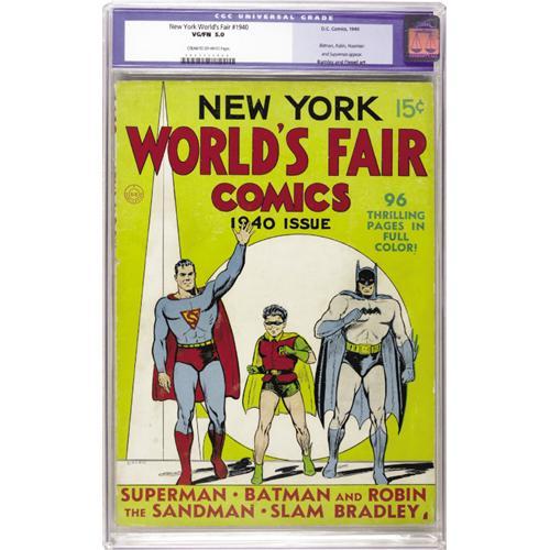 <B>New York World's Fair Comics 1940 (DC, 1940) CGC VG/FN 5.0 Cream to off-white comics.</B></I> Two of the best DC artists of the day, Creig Flessel and Jack Burnley contributed to this issue, and Burnley also did the cover, his first. This precursor to <B>World's Best Comics</B></I>, later to become <B>World's Finest Comics</B></I>, showed Superman, Batman, and Robin together for the first time. Overstreet 2006 VG 4.0 value = $2,256; FN 6.0 value = $3,384. CGC census 12/06: 4 in 5.0, 15 higher.<BR><BR><b>Shipping:</b> Slabbed Comic (<a target="_blank" href="http://www.heritageauctions.com/common/shipping.php">view shipping information</a>)