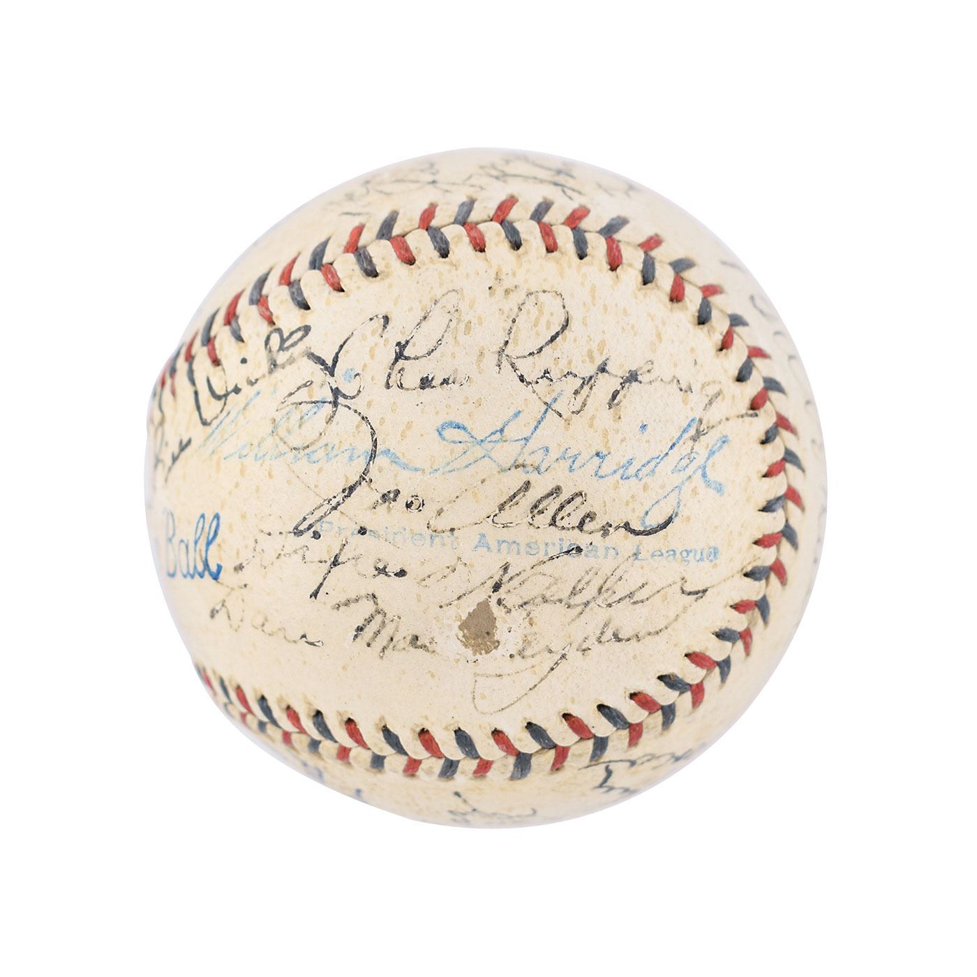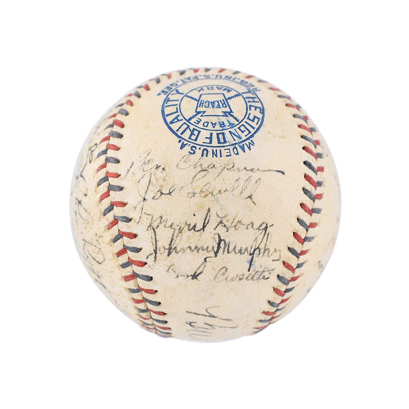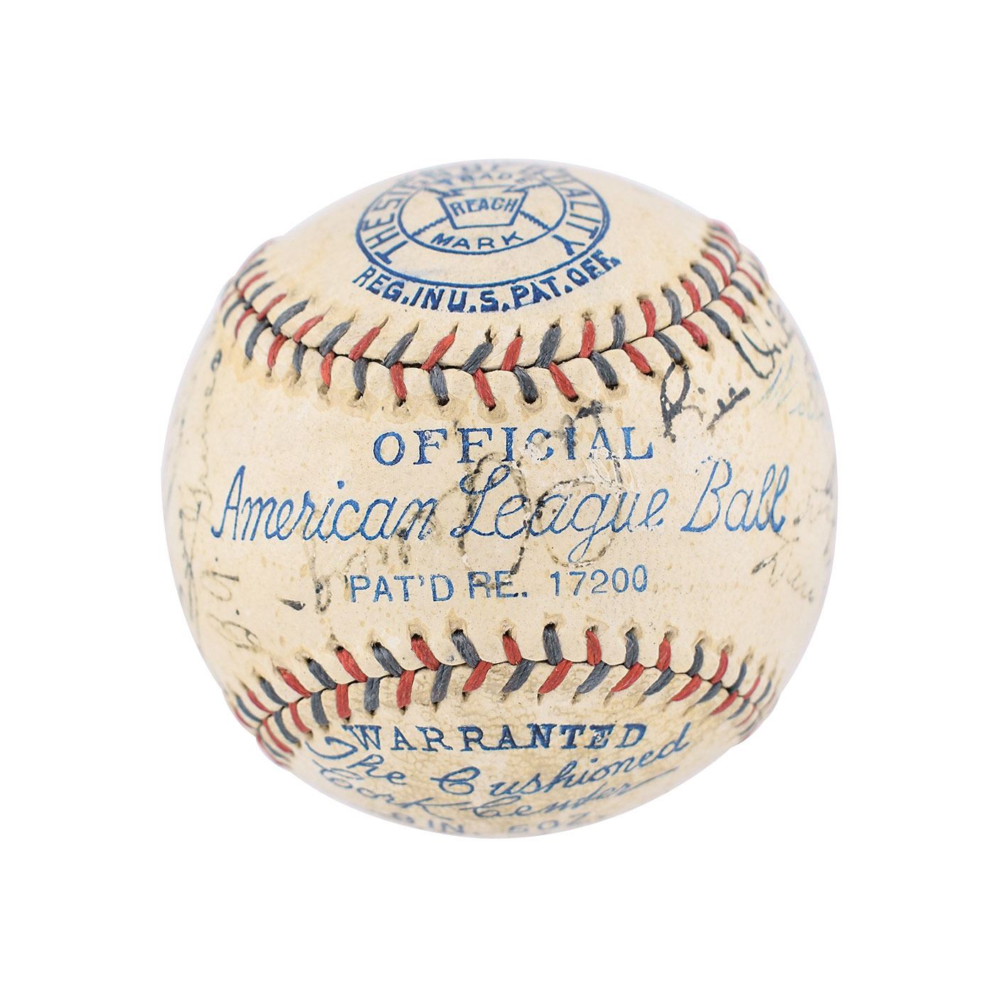 Official Reach American League (Harridge) baseball signed in fountain pen on the sweet spot and side panels by 21 members of the 1934 New York Yankees team, including: Babe Ruth (ss), Lou Gehrig (lightly, over league stamp), Earle Combs, Bill Dickey, Red Ruffing, Johnny Allen, Dixie Walker, Danny MacFayden, Red Rolfe, Don Heffner, John Broaca, Ben Chapman, Joe Sewell, Myril Hoag, Johnny Murphy, Frank Crosetti, Jack Saltzgaver, Sam Byrd, Art Jorgens, Jimmie DeShong, and Russ Van Atta. Burleigh Grimes and Lefty Gomez are clubhouse. In very good to fine condition, with a thin coating of shellac, a small scuff to Ruth's signature, and Gehrig's signature light and moderately contrasted as he signed over "Official American League Ball." Accompanied by the damaged original cardboard baseball box. In Ruth's final season in New York, the Yankees finished second to Detroit; Gehrig won the Triple Crown, hitting .363 with 49 homers and 166 RBI.