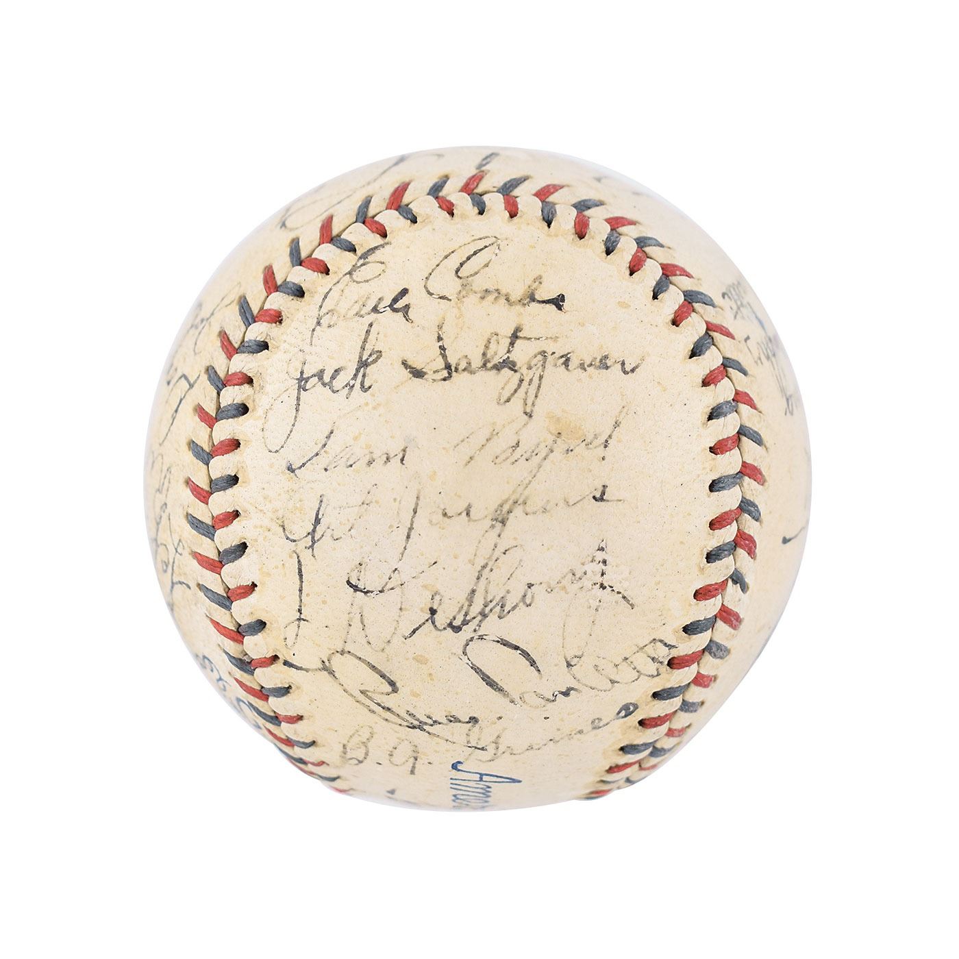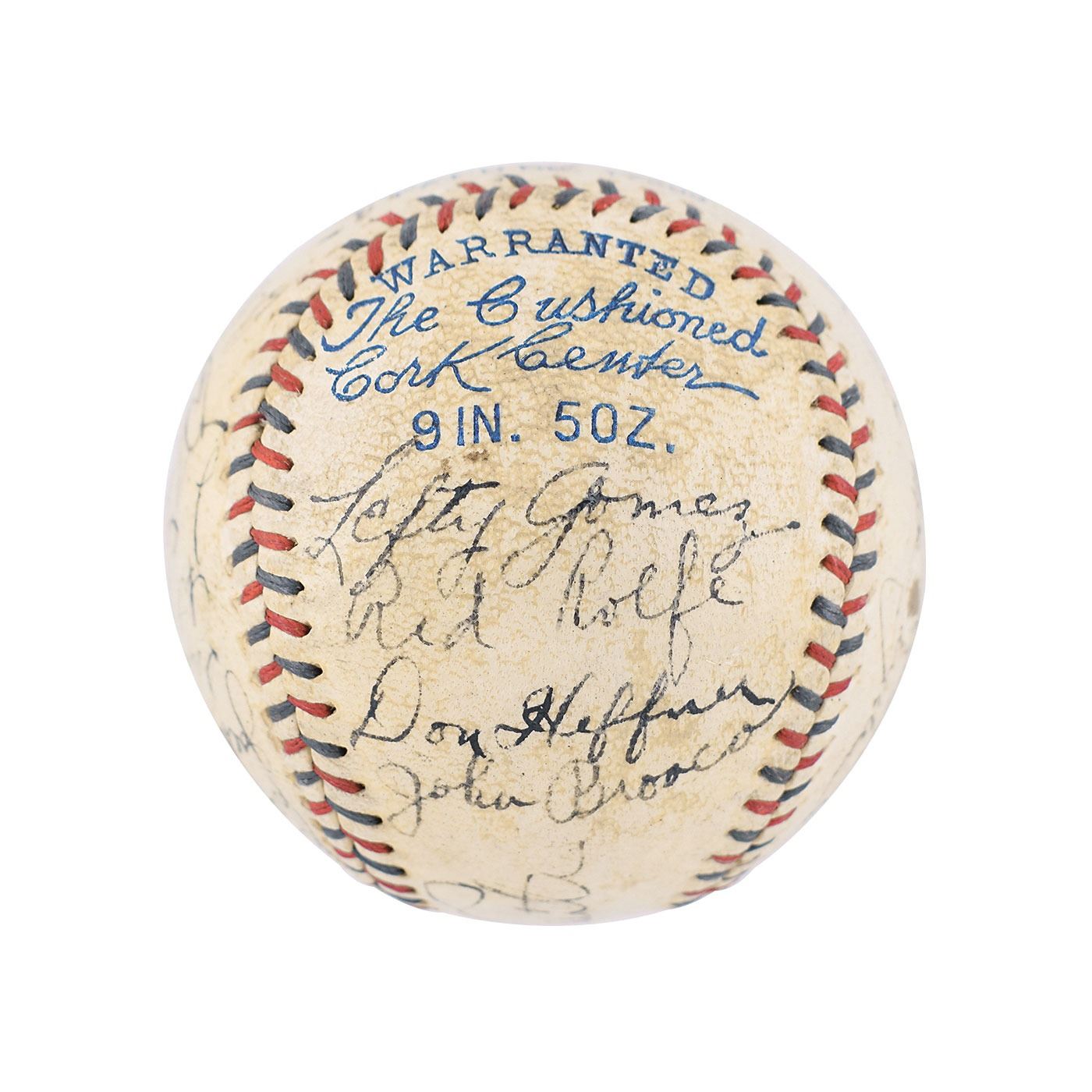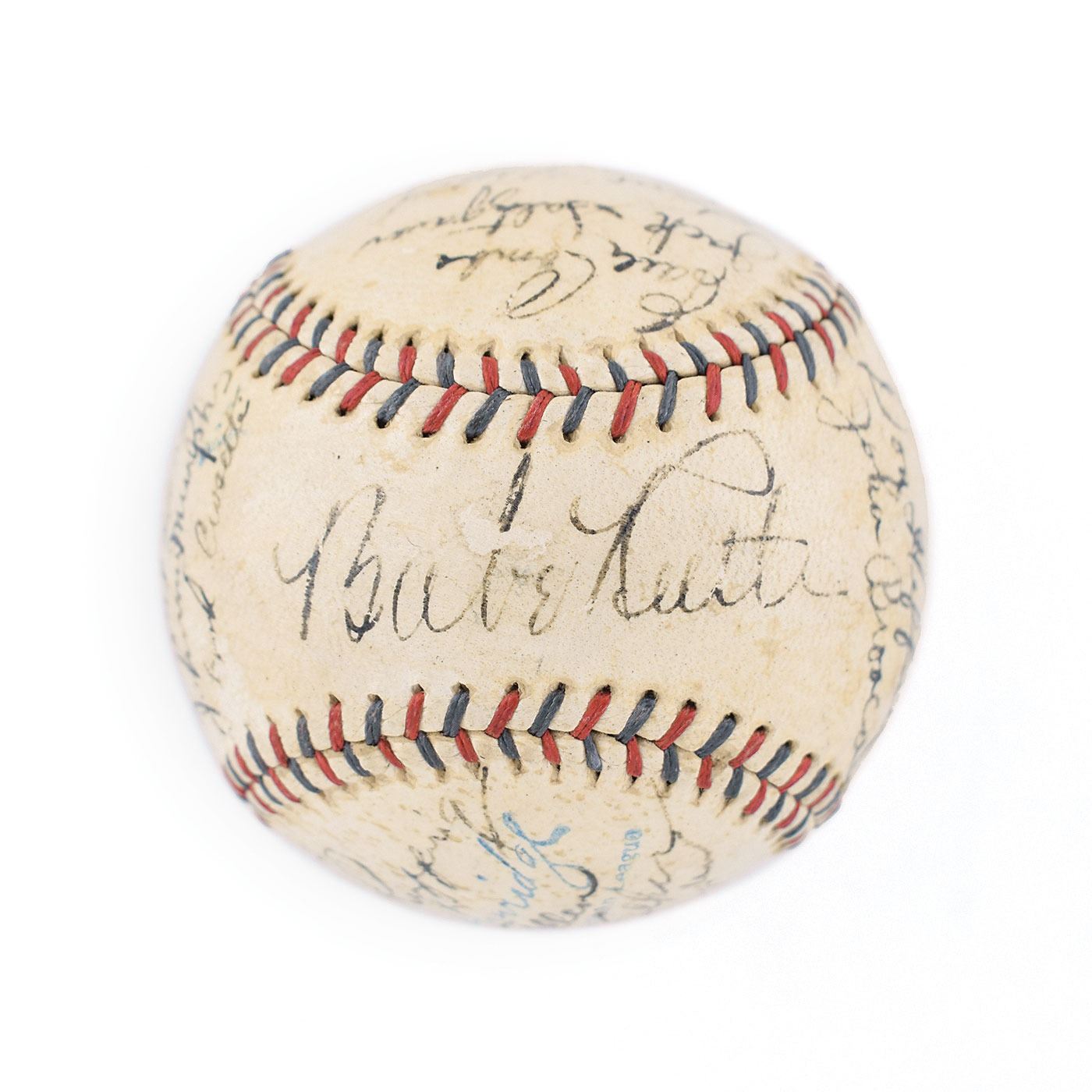Official Reach American League (Harridge) baseball signed in fountain pen on the sweet spot and side panels by 21 members of the 1934 New York Yankees team, including: Babe Ruth (ss), Lou Gehrig (lightly, over league stamp), Earle Combs, Bill Dickey, Red Ruffing, Johnny Allen, Dixie Walker, Danny MacFayden, Red Rolfe, Don Heffner, John Broaca, Ben Chapman, Joe Sewell, Myril Hoag, Johnny Murphy, Frank Crosetti, Jack Saltzgaver, Sam Byrd, Art Jorgens, Jimmie DeShong, and Russ Van Atta. Burleigh Grimes and Lefty Gomez are clubhouse. In very good to fine condition, with a thin coating of shellac, a small scuff to Ruth's signature, and Gehrig's signature light and moderately contrasted as he signed over "Official American League Ball." Accompanied by the damaged original cardboard baseball box. In Ruth's final season in New York, the Yankees finished second to Detroit; Gehrig won the Triple Crown, hitting .363 with 49 homers and 166 RBI.