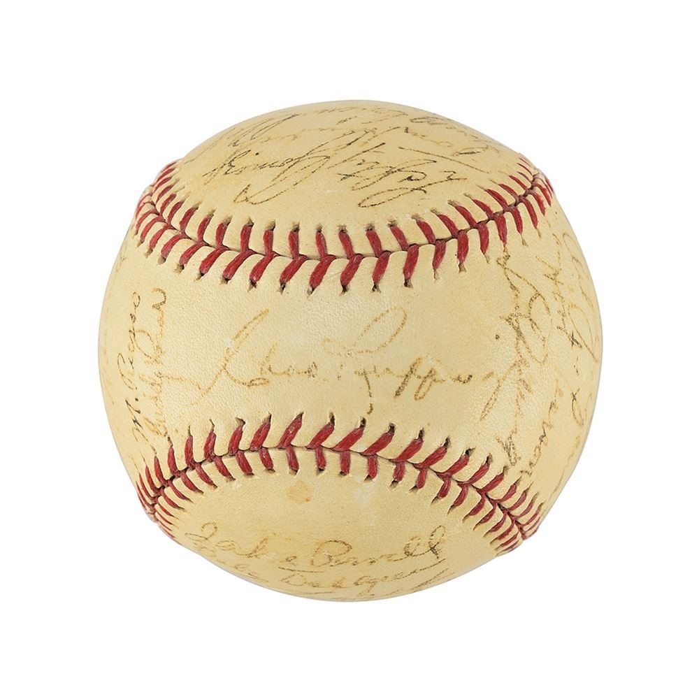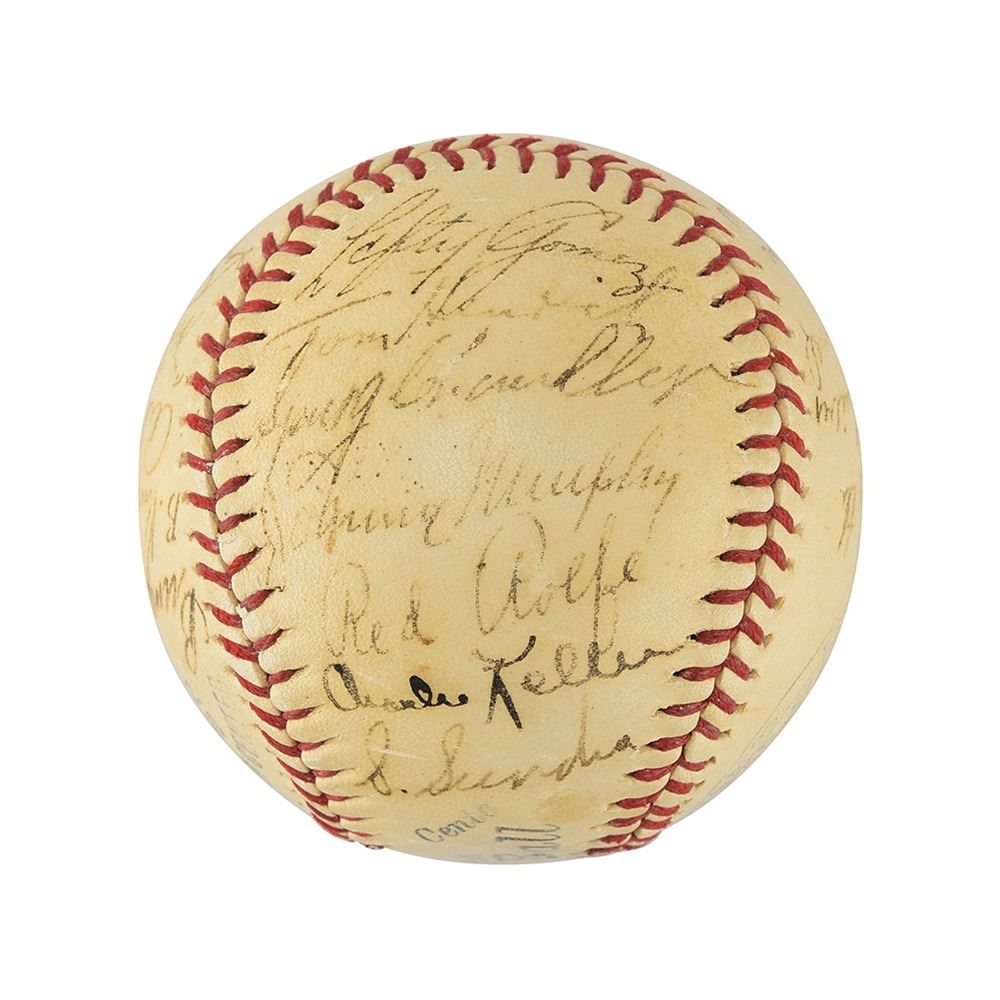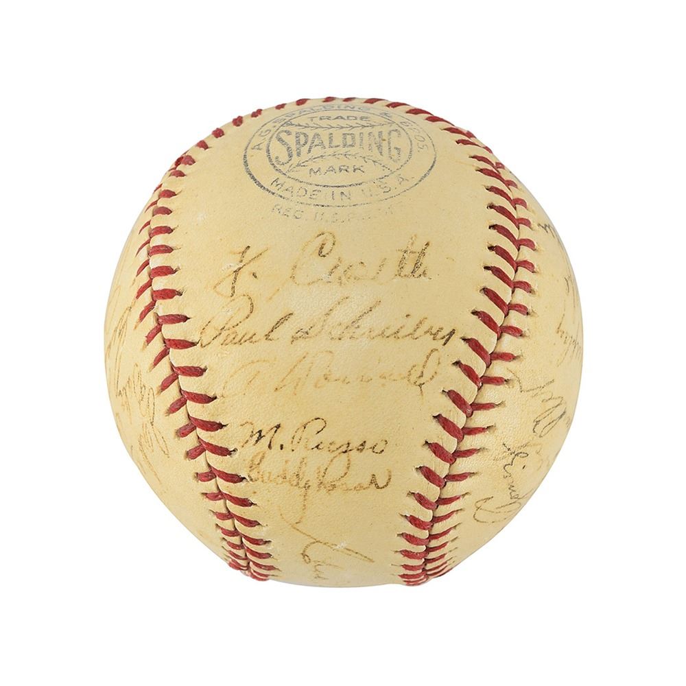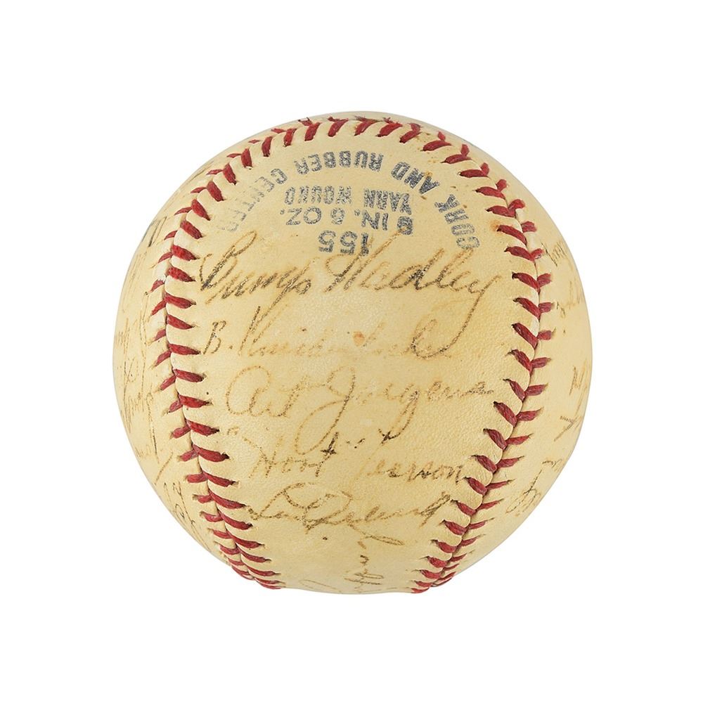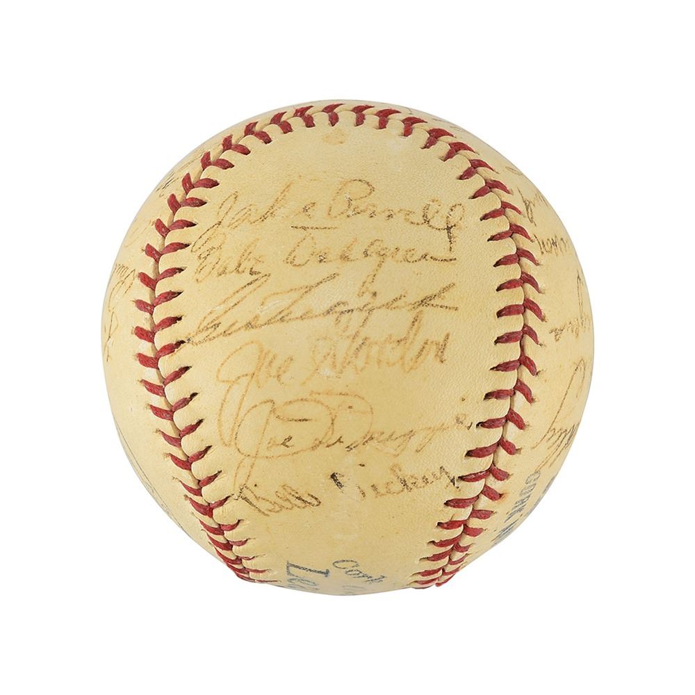 This is an extremely rare team-signed baseball including Joe DiMaggio and the rare Lou Gehrig signature.