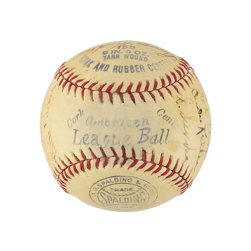The ball itself has some areas of scuffing, with the label scuffed enough where the name "AMERICAN" and portions of "LEAGUE BALL" has been enhanced. Signatures range from "5-7" with a few lesser. The Gehrig and DiMaggio signatures are better, with a small scrape near the top of Gehrig. According to multiple authenticators, the Bill Dickey signature has been determined to be clubhouse, with JSA and PSA/DNA adding Gomez to the clubhouse list.