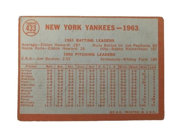 New York Yankees- 1963 Topps baseball card. Notes the 1963 batting leaders and pitching leaders and the team stats by player. Protected in 2 layers of plastic (hard and soft plastic card holders). Condition: Fair. corner damage in top right. 2 small markings on top not noticeable when under plastic.