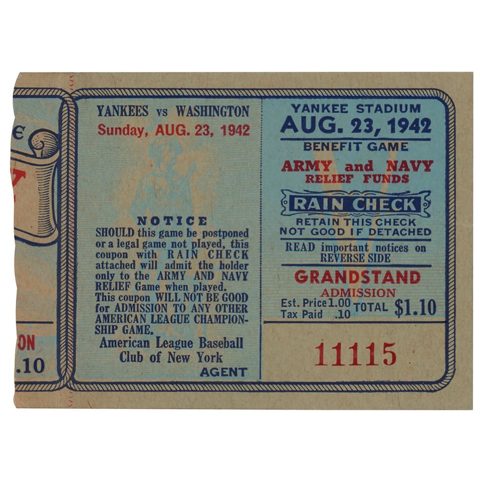 Ticket stub for a grandstand seat at the military benefit exhibition between the New York Yankees and Washington Senators at Yankee Stadium on August 23, 1942, which raised $80,000 for the Army and Navy Relief Funds during World War II. The game is remembered for a matchup between Walter Johnson and Babe Ruth: the 54-year-old hurler threw 17 pitches to the 47-year-old slugger, who slammed the final pitch over the right field fence (just foul). Playing to the crowd, Ruth circled the bases anyway and left the field to a rousing ovation. In fine condition.