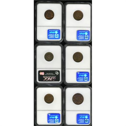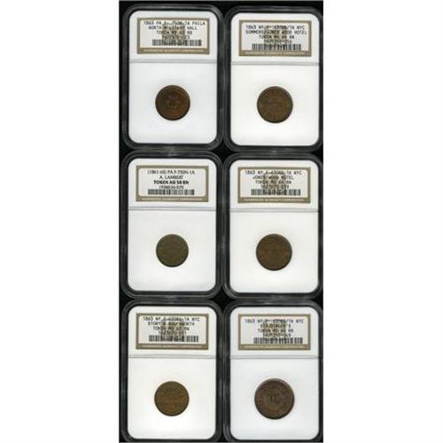 <B>New York and Pennsylvania Civil War Store Card Lot.</B></I> All certified by NGC. An <B>1863 Jones Wood Hotel/I. Sommers, New York, NY, Fuld-NY630BR-1a, R.2, MS64 Brown NGC,</B></I> (two pieces), one with much red remaining and choice, the second with less red, but deep plum and magenta patination, lustrous; an <B>1863 Staudinger's, New York, NY, Fuld-NY630BS-1a, R.2, MS64 Red and Brown NGC,</B></I> lovely and lustrous; an <B>1863 Story & Southworth, New York, NY, Fuld-NY630BV-1a, R.1, MS63 Brown NGC;</B></I> an <B>1863 North Military Hall, Philadelphia, PA, Fuld-PA750M-1a, R.2, MS62 Red and Brown NGC,</B></I> much red remains on this nice token that appears undergraded; and an <B>(1861-65) A. Lambert, Philadelphia, PA, Fuld-PA750N-1a, R.4, AU58 NGC.</B></I> An attractive big-city lot with superb eye appeal. The current market value is about $225-$300.<BR><BR><b>Shipping:</b> Coins & Currency (<a target="_blank" href="http://www.heritageauctions.com/common/shipping.php">view shipping information</a>)