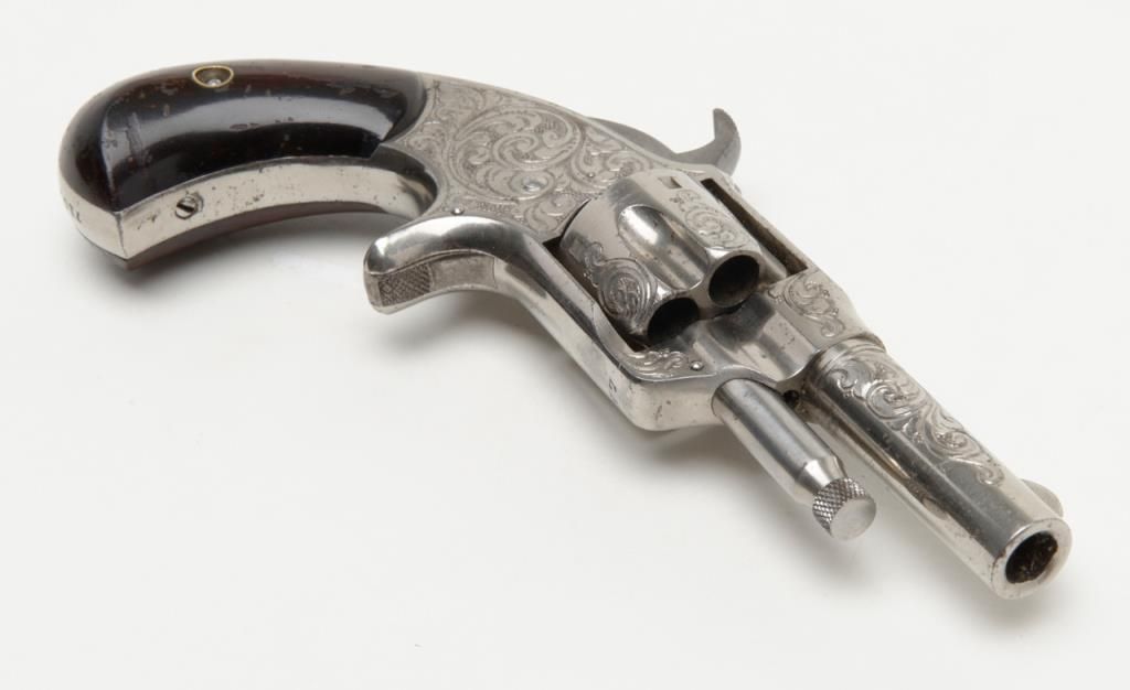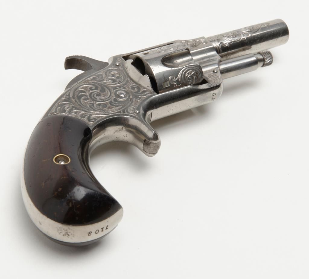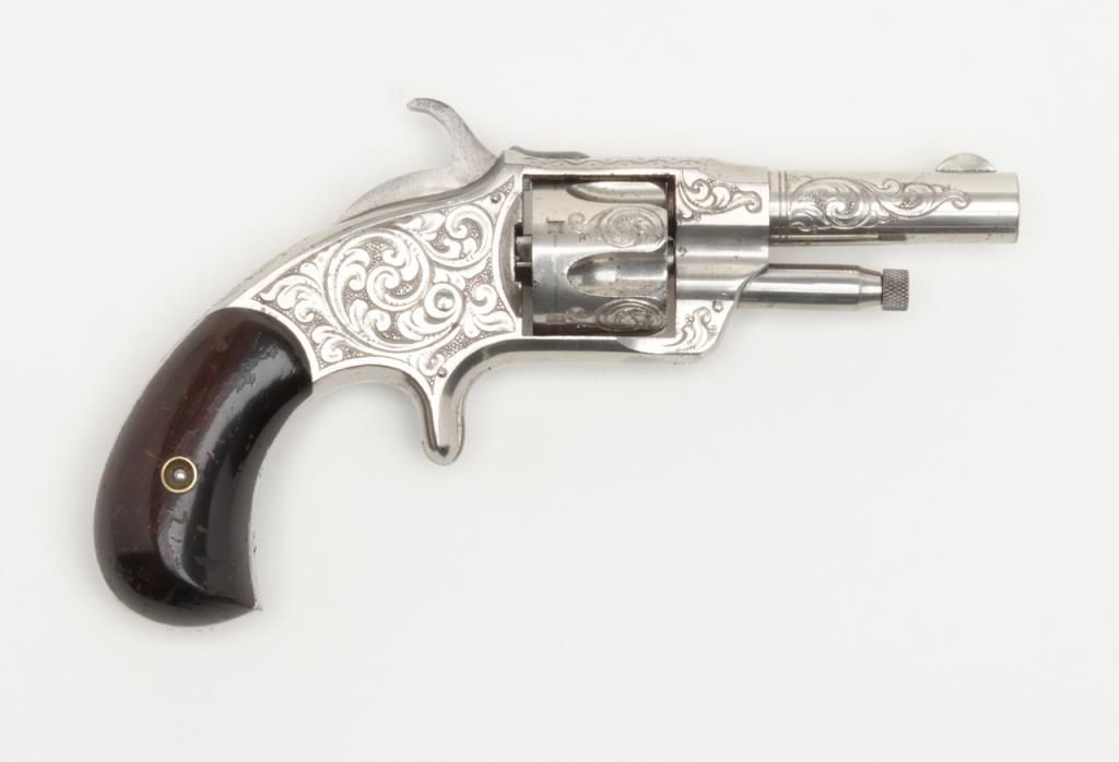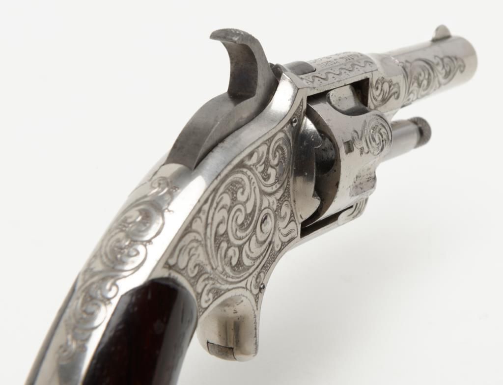 New York engraved and “L.N.” signed (Nimschke) Otis Smith .30 caliber rimfire revolver with 2 5/8” barrel, nickel plated, varnished grips showing the name and patent “April 15, 1873” on the top of the frame. This pistol remains in fineto near excellent original condition showing 95% plus bright original nickel with just some very minor pinprick pitting starting in a couple of minuscule areas. Serial number 7103. Very few 19th-century American arms show the signature ofthis top New York master engraver. Very desirable. Est.: $3,500-$7,000