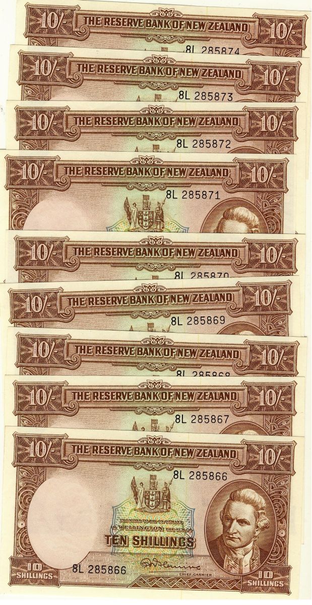 New Zealand, 1967 10 shillings. Run of 9 consecutive notes. All EF+ or better.