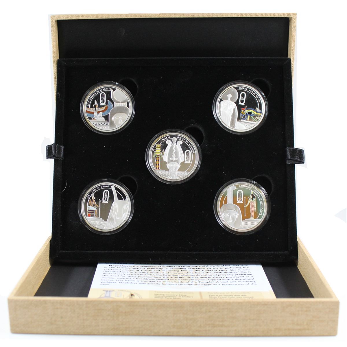 New Zealand; 2013 Niue Mythologies of the World - Story of Osiris Fine Silver 5-coin Set (Tax Exempt). You will receive: Horus, Osiris, Isis, Set, and Nephthys. Each coin is encapsulated and accompanied by a COA. Coins come housed in the Deluxe Mint issued Display Case. Please note coins may have light toning.