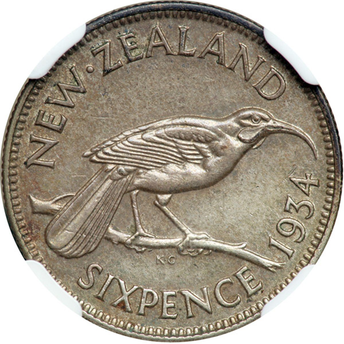 New Zealand. 6 Pence, 1934. KM-2. George V. Toned. NGC graded MS-62.