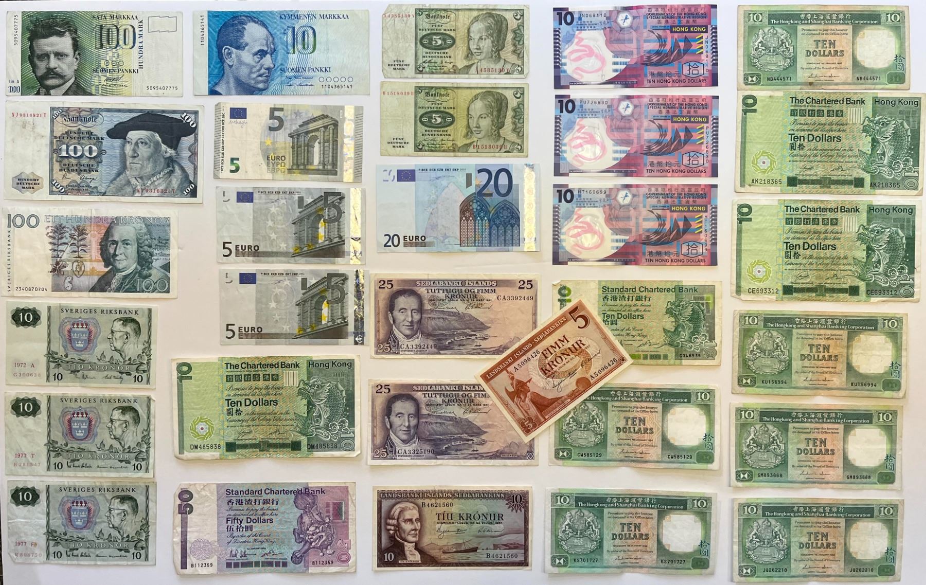 New Zealand, Iceland, Hong Kong, Sweden, France, Germany, Findland Lot of 50+ notes, Face Value:$30