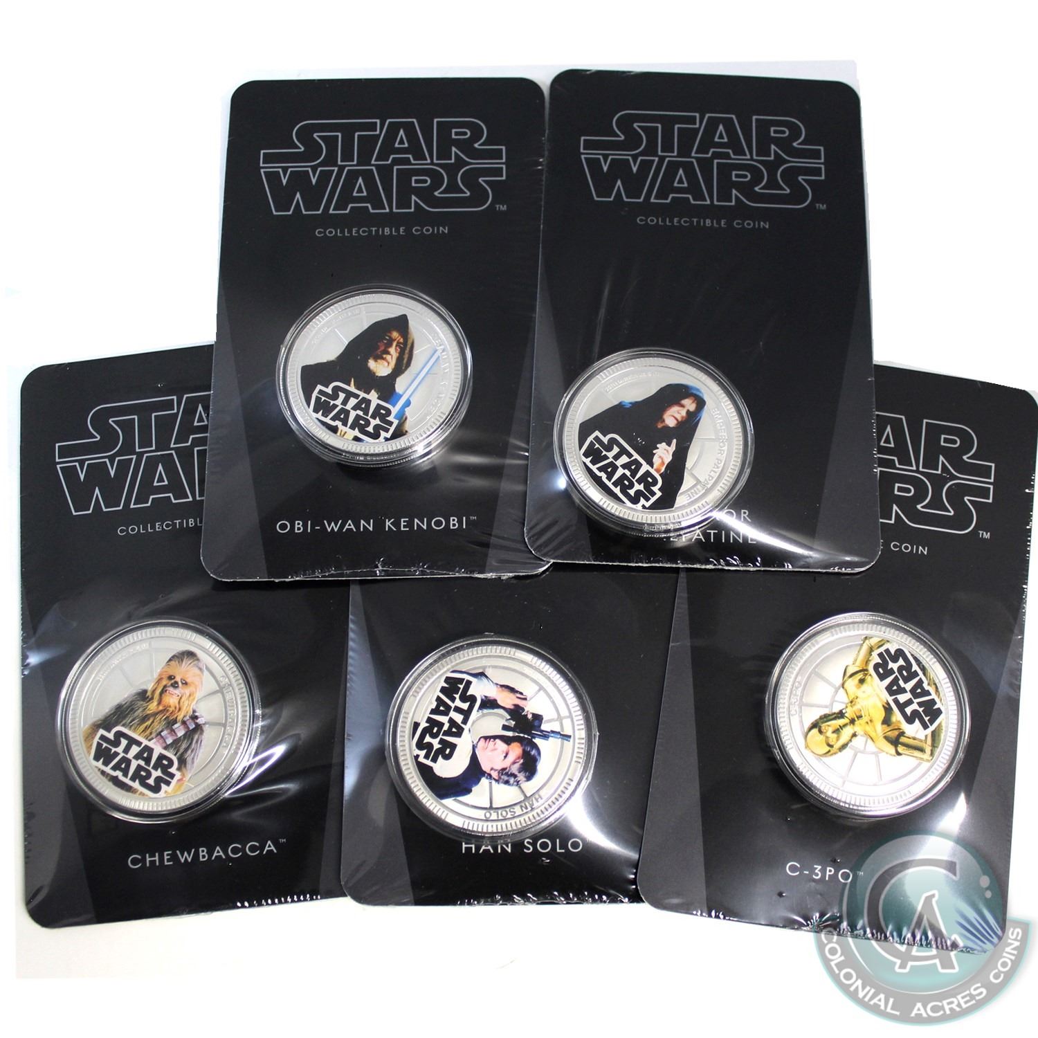 New Zealand Mint Issue: Lot of 5x 2011 Niue Star Wars Coloured Silver Plated Collectable Coins in Original Plastic Wrap. You will receive Emperor Palpatine, C-3PO, Chewbacca, Obi-Wan Kenobi & Han Solo. 5pcs