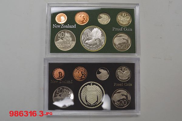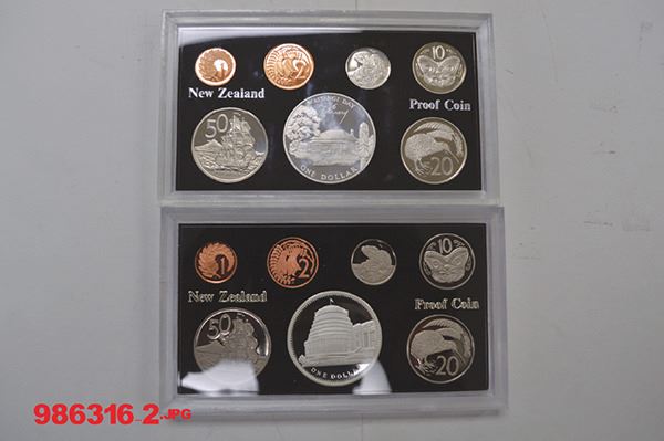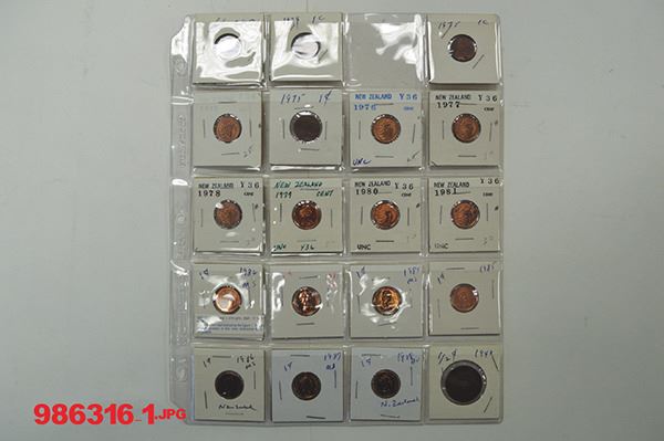 New Zealand. Half Cents, Cents, just a few modern 2 dollar issues. Preponderance is Uncirculated Sets in cases: 1965, 1970, 1991, 1992, 1993; Proof Sets in cases: 1977, 1978, 1979, 1980. Plus 4 5 Dollar Expo 1992 set. Just over 172 pieces with virtually no silver.